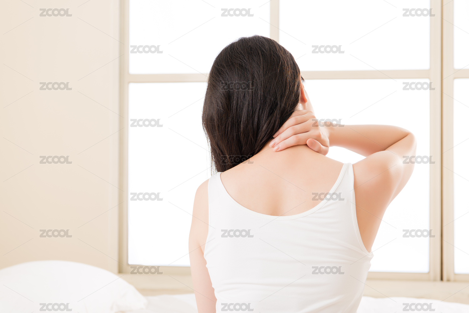 亚洲美丽的痛苦肩颈酸痛疲惫的坐在了床上。卧室背景。后视图