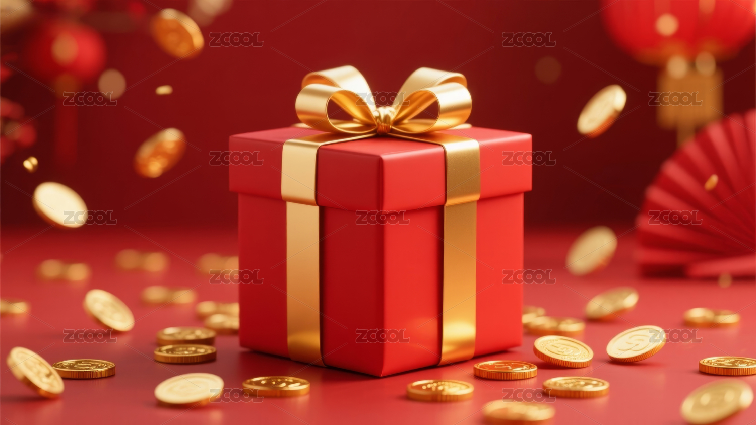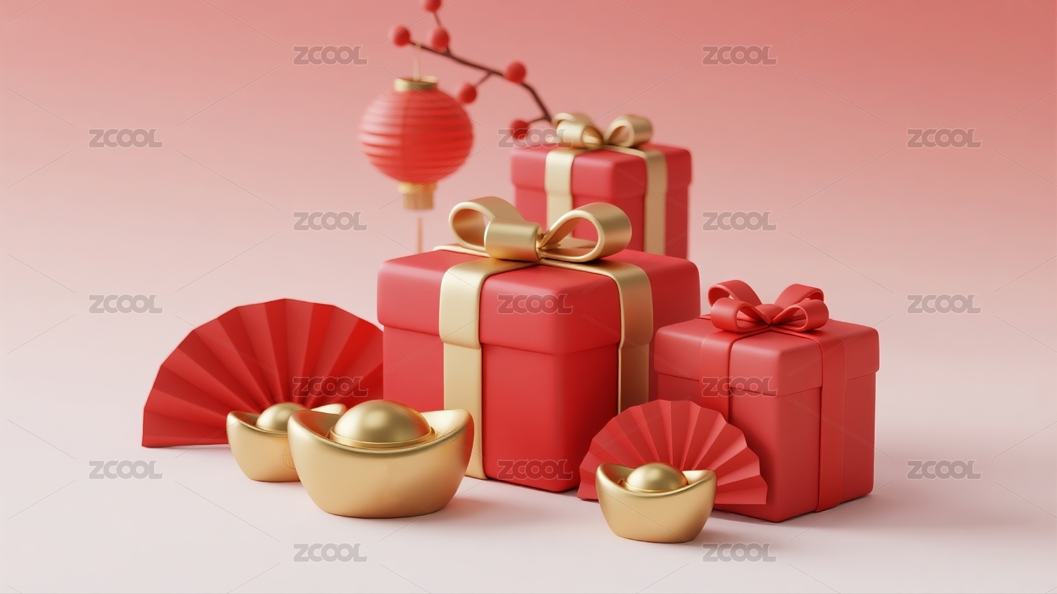 巨大蝴蝶结礼盒与金元宝红包新年元素背景