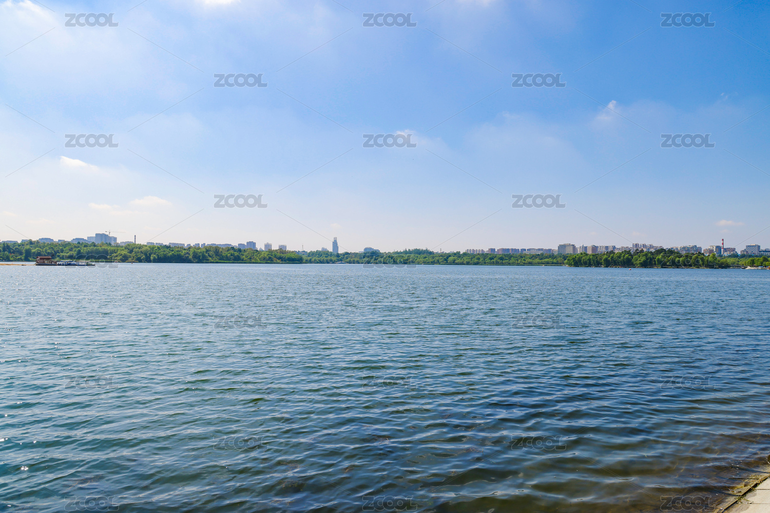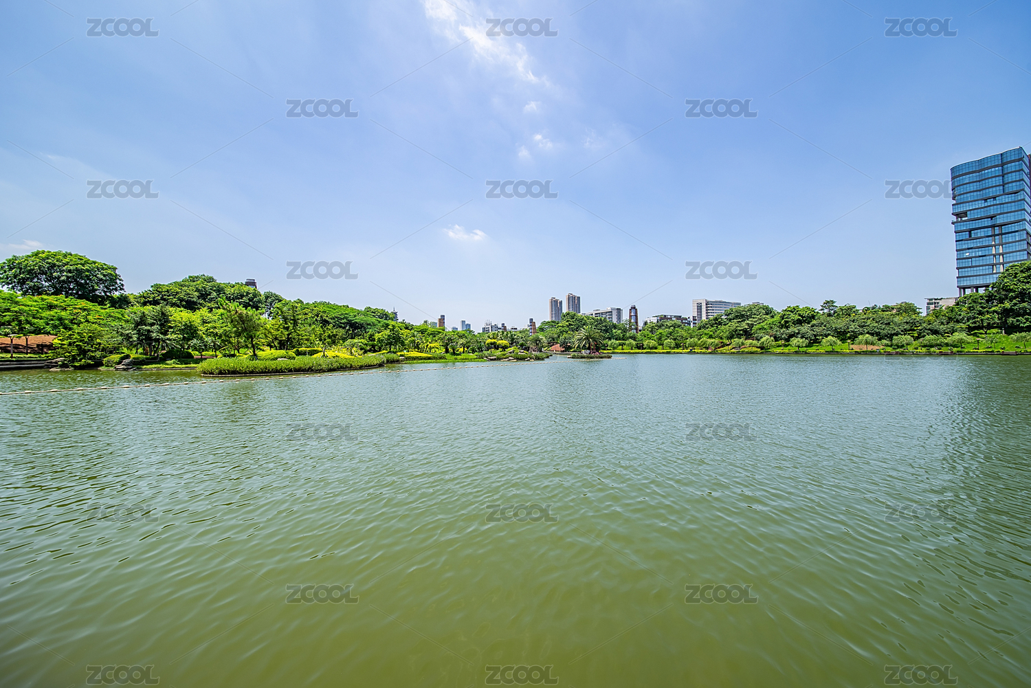 阳光下公园里的湖泊和远处拔地而起的商业楼盘建筑