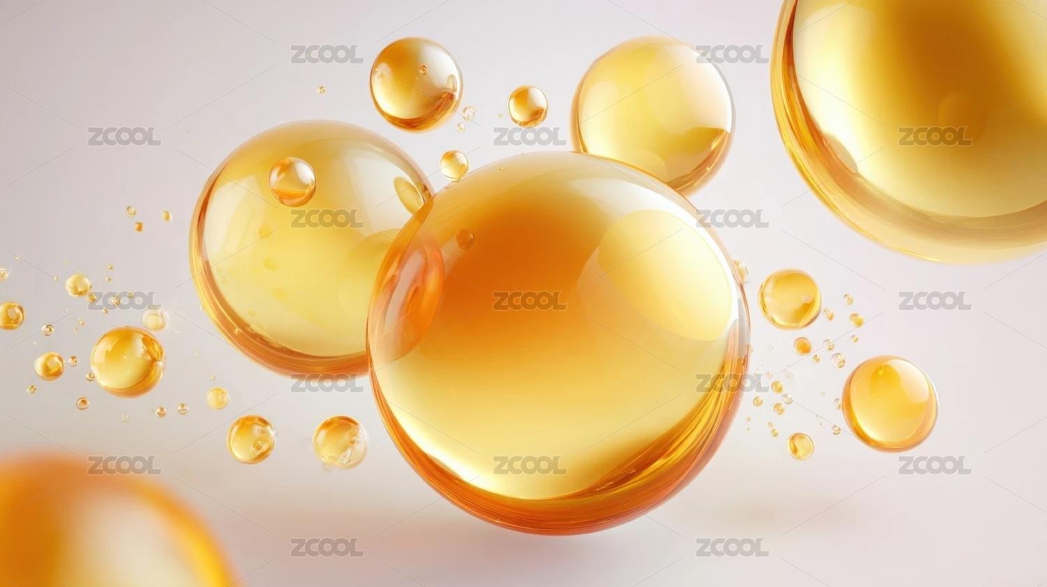 金黄色透明液滴在柔和光线下漂浮