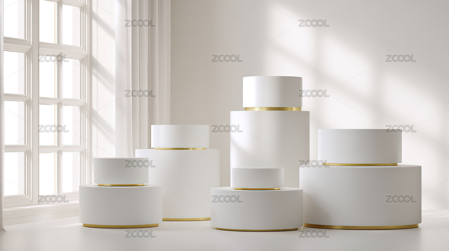 白色圆柱形展示台排列