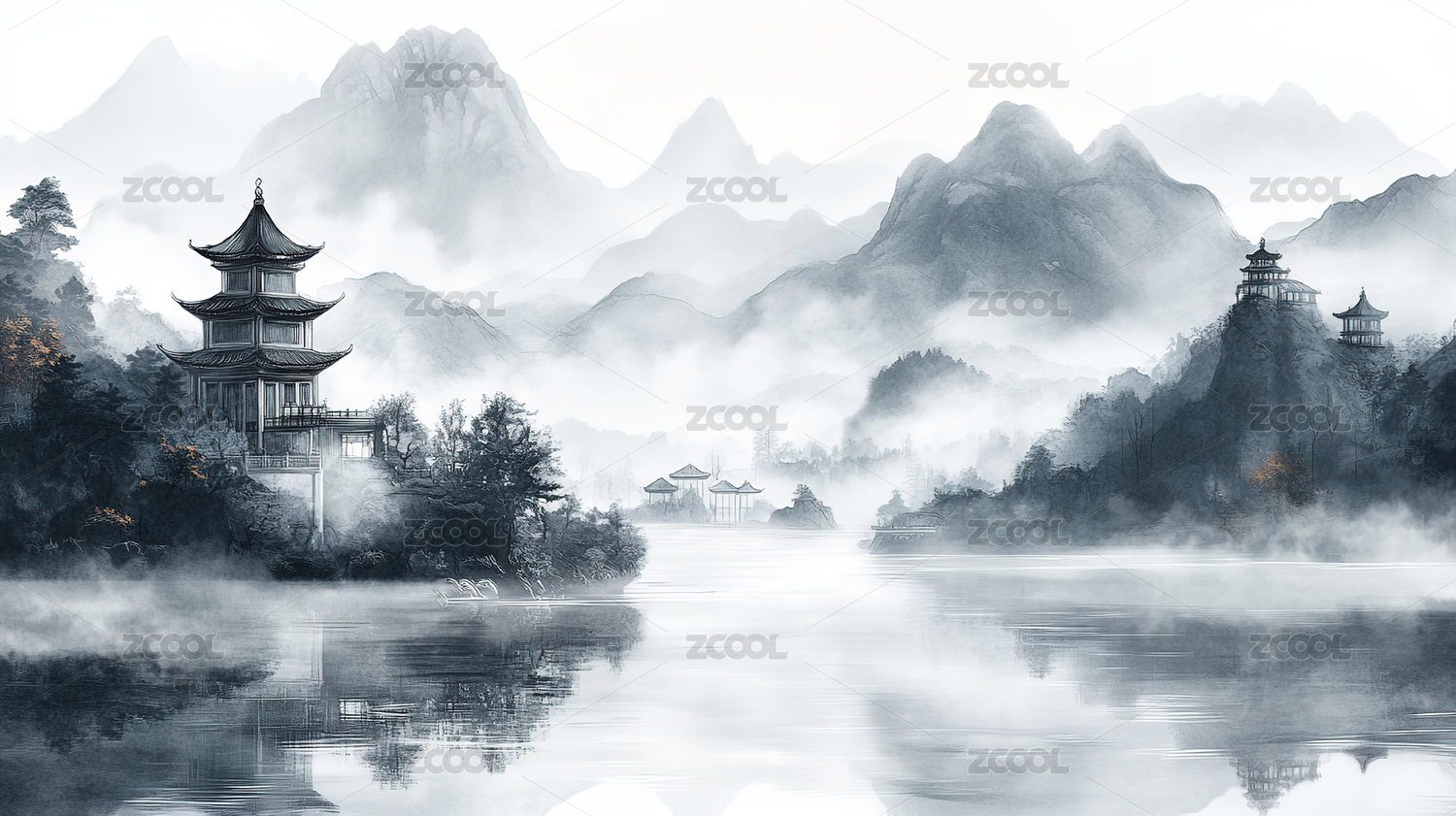 高山,地形,自然美,AI数字艺术,风景,宁静,户外,水墨画,云,天空
