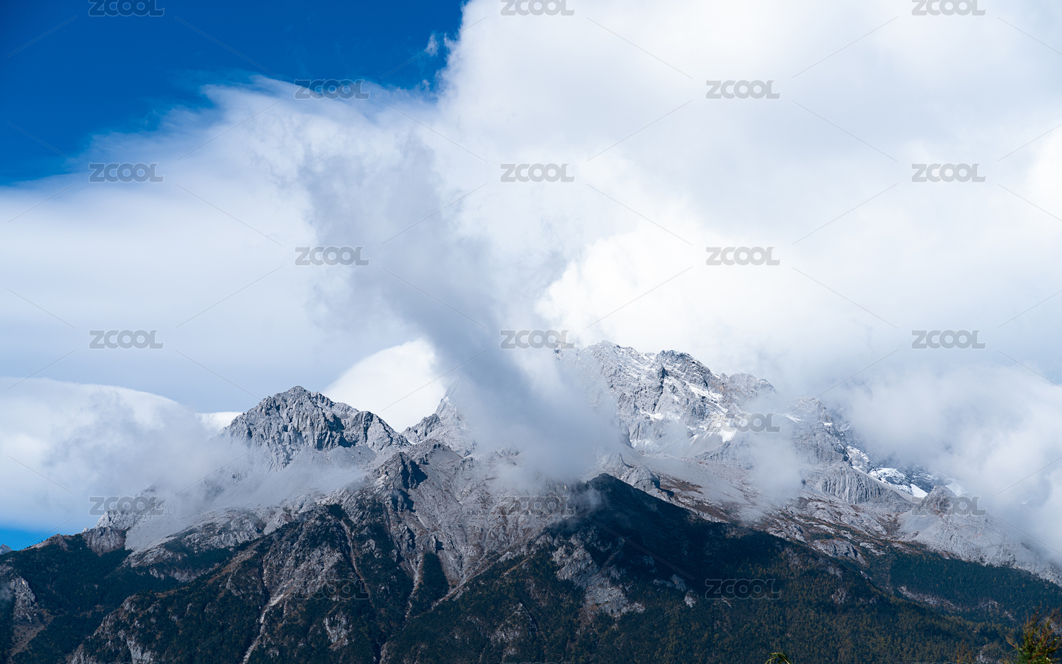 傍晚拍摄云雾中的云南丽江玉龙雪山