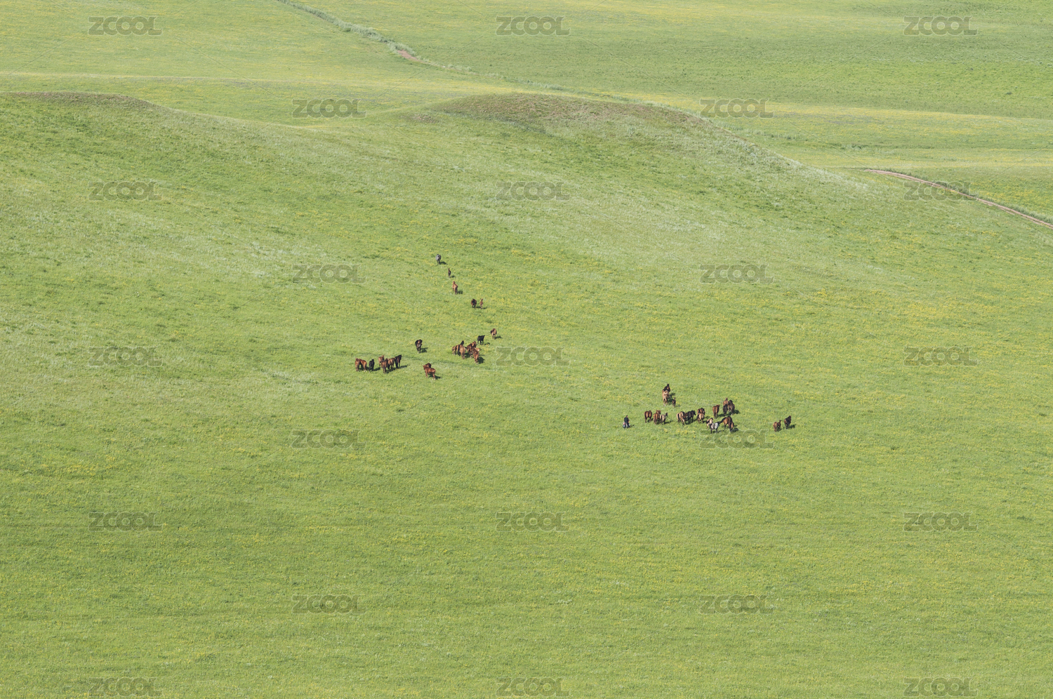 清晨牧民赶着马群策马奔腾在乌兰布统草原上
