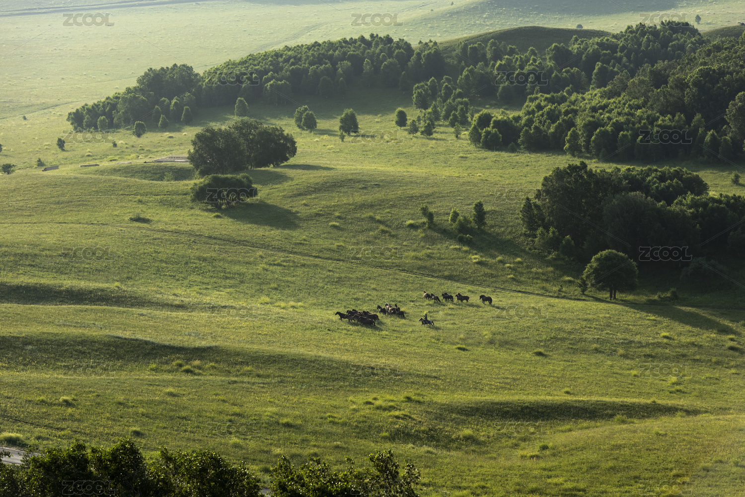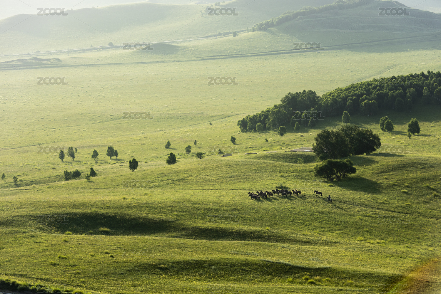 清晨在内蒙古乌兰布统草原牧民赶着马群去放牧