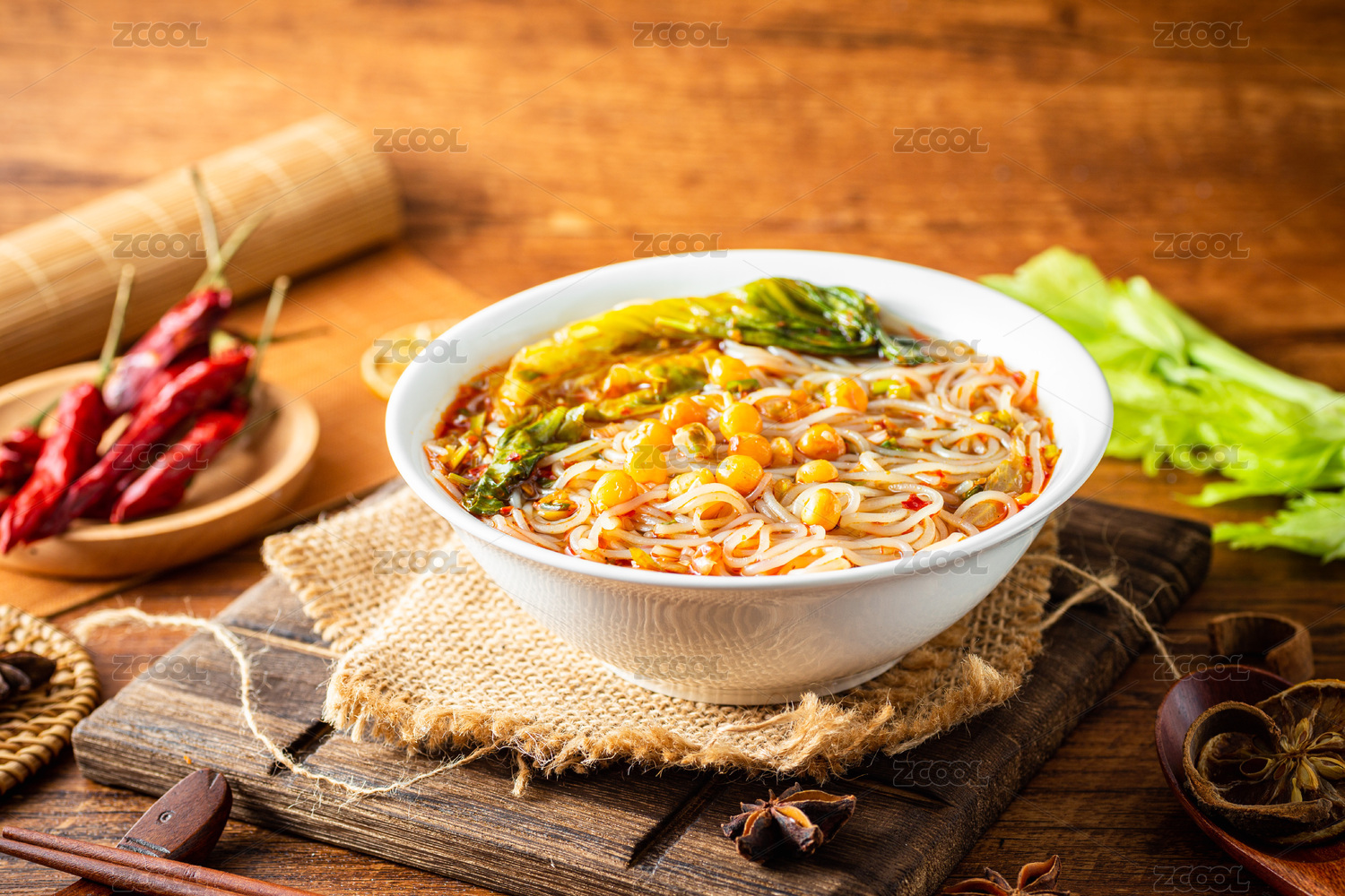 广西特色小吃螺蛳粉摆放在木桌面上特写