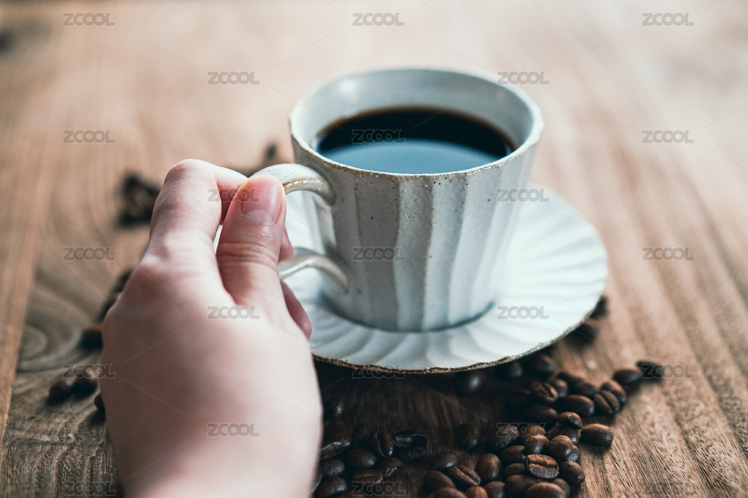 一杯咖啡和咖啡豆摆放在桌面上特写