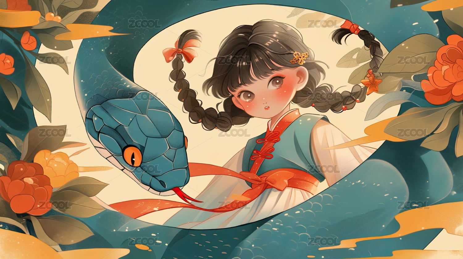 穿汉服的女孩和中国蛇