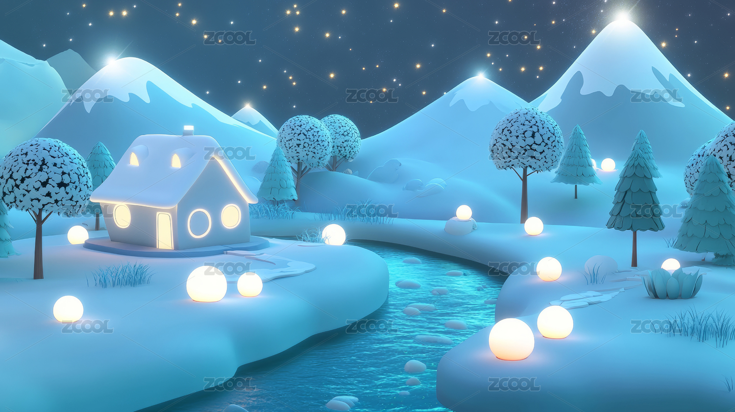 3D卡通冬天植物雪山背景