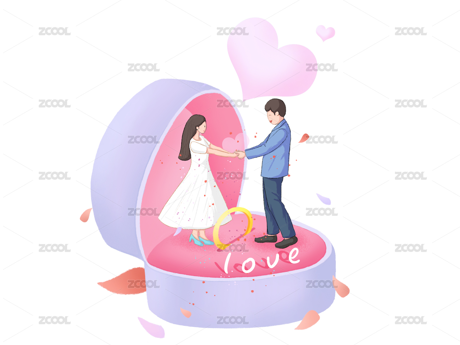 情侣在爱心礼盒里跳舞爱心背景抽象插画