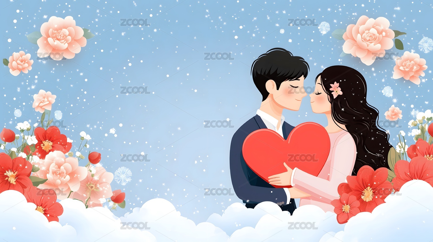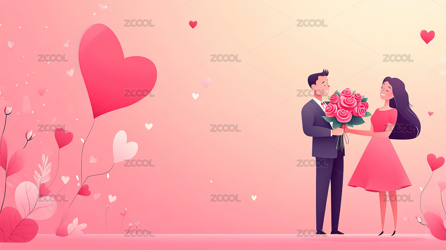 打伞的情侣和粉色玫瑰花爱心背景