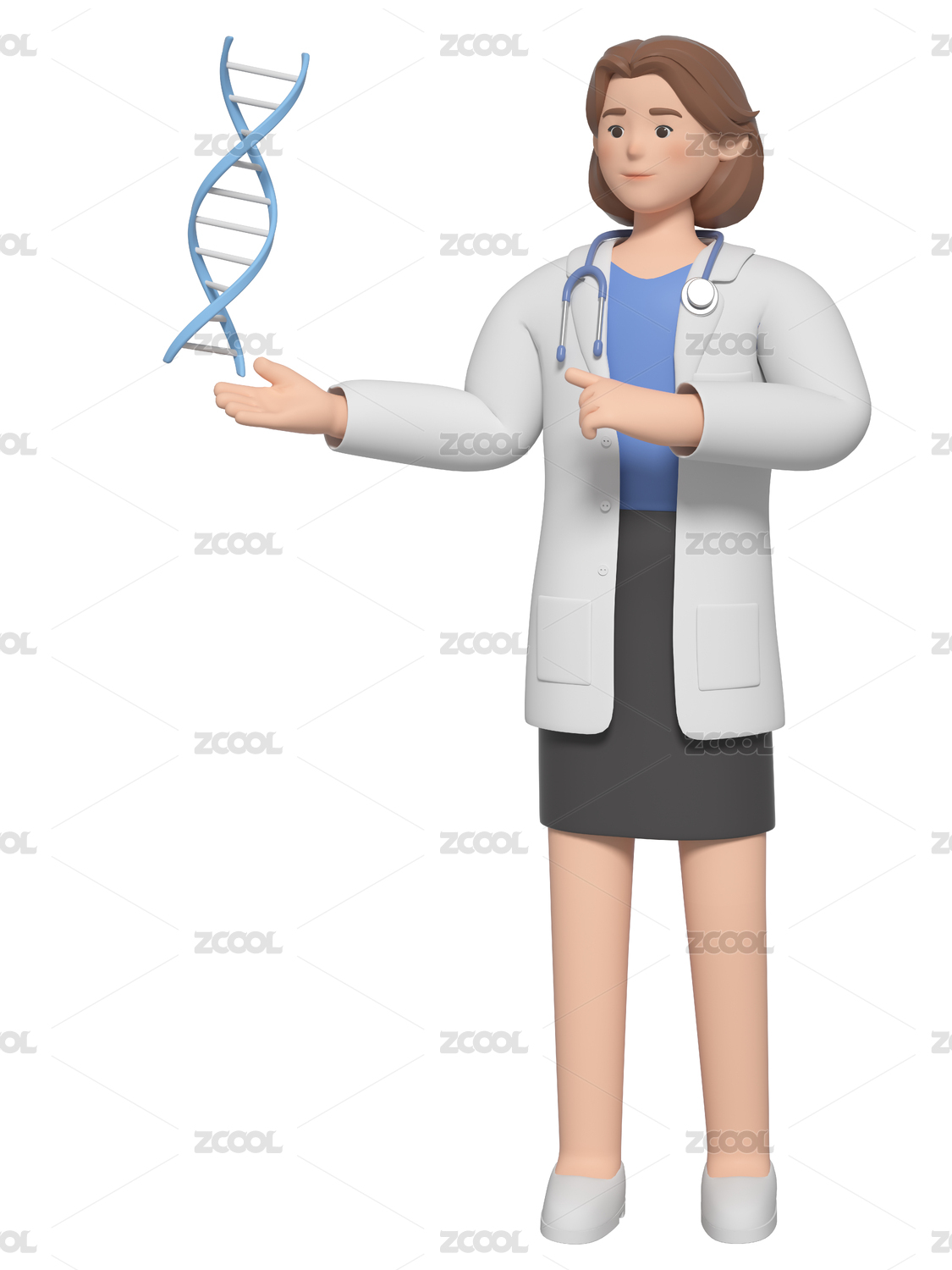 卡通女性科研人员与DNA结构3D渲染