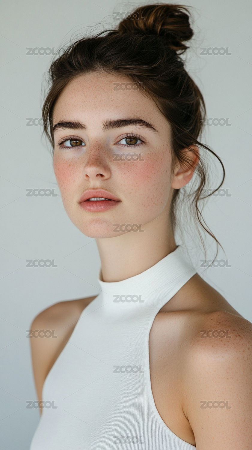 一位拥有雀斑和柔顺发型的年轻女性肖像