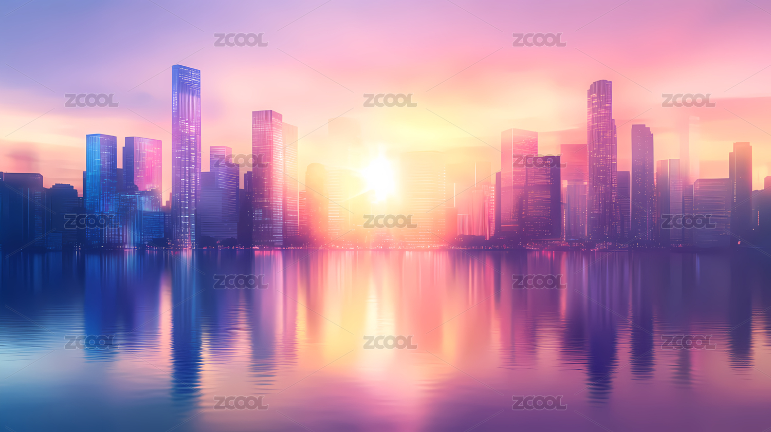 日出,蓝天,自然光,宁静,建筑设计,清晨,城市,水面倒影,现代建筑,科技感