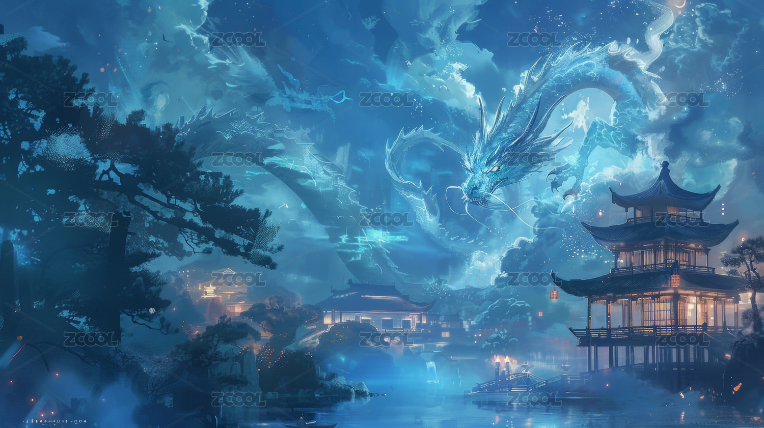 自然,艺术,梦幻,蓝色,龙,塔,云,樱花,天空,建筑