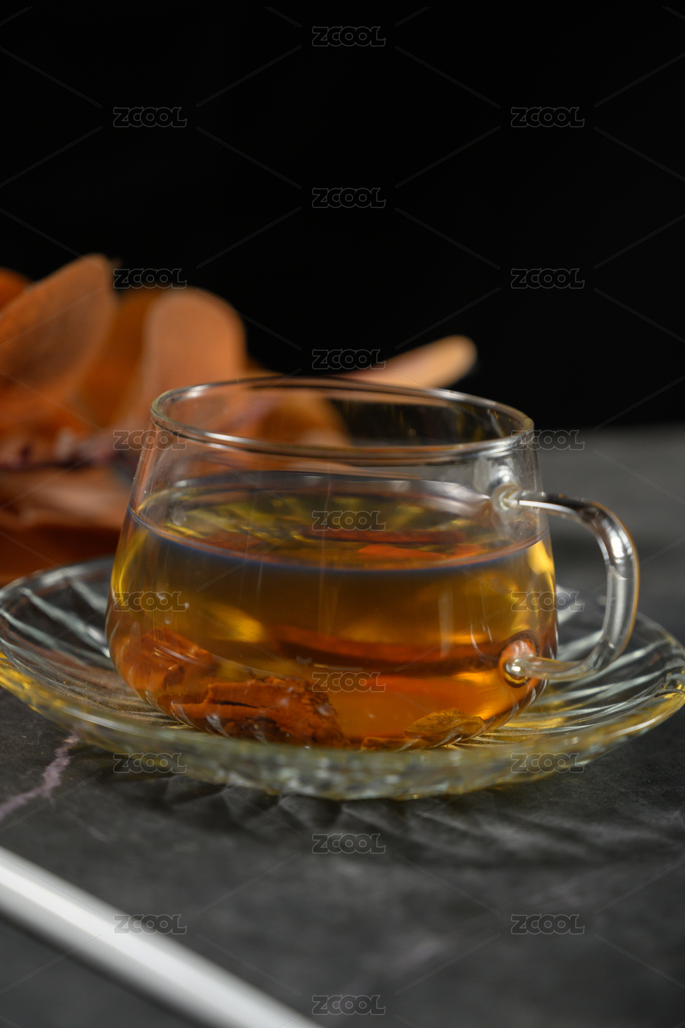 桌面上的杯子里的甘甜可口的陈皮白茶