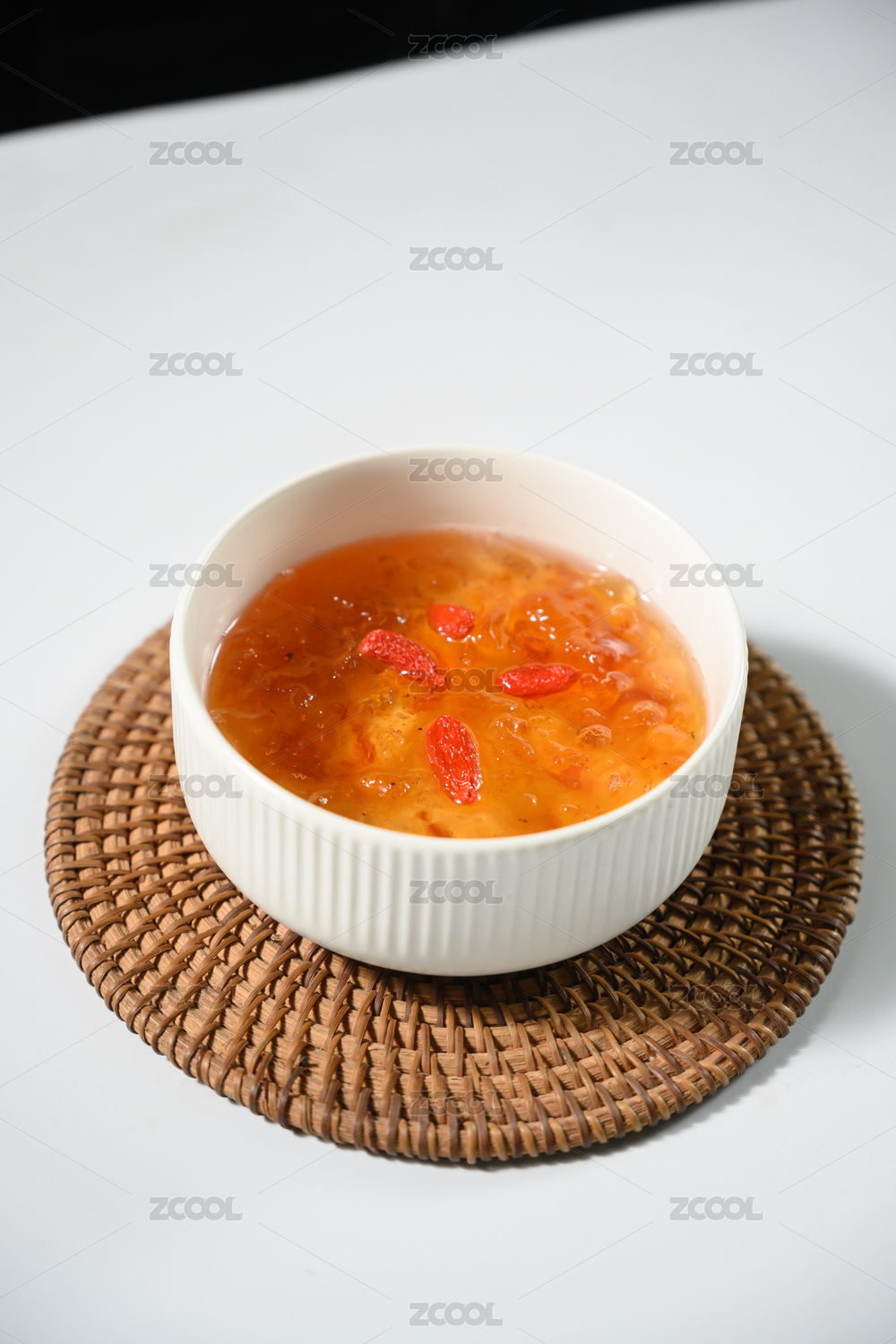 桌面上的盘子里的美味可口的冰糖炖桃胶