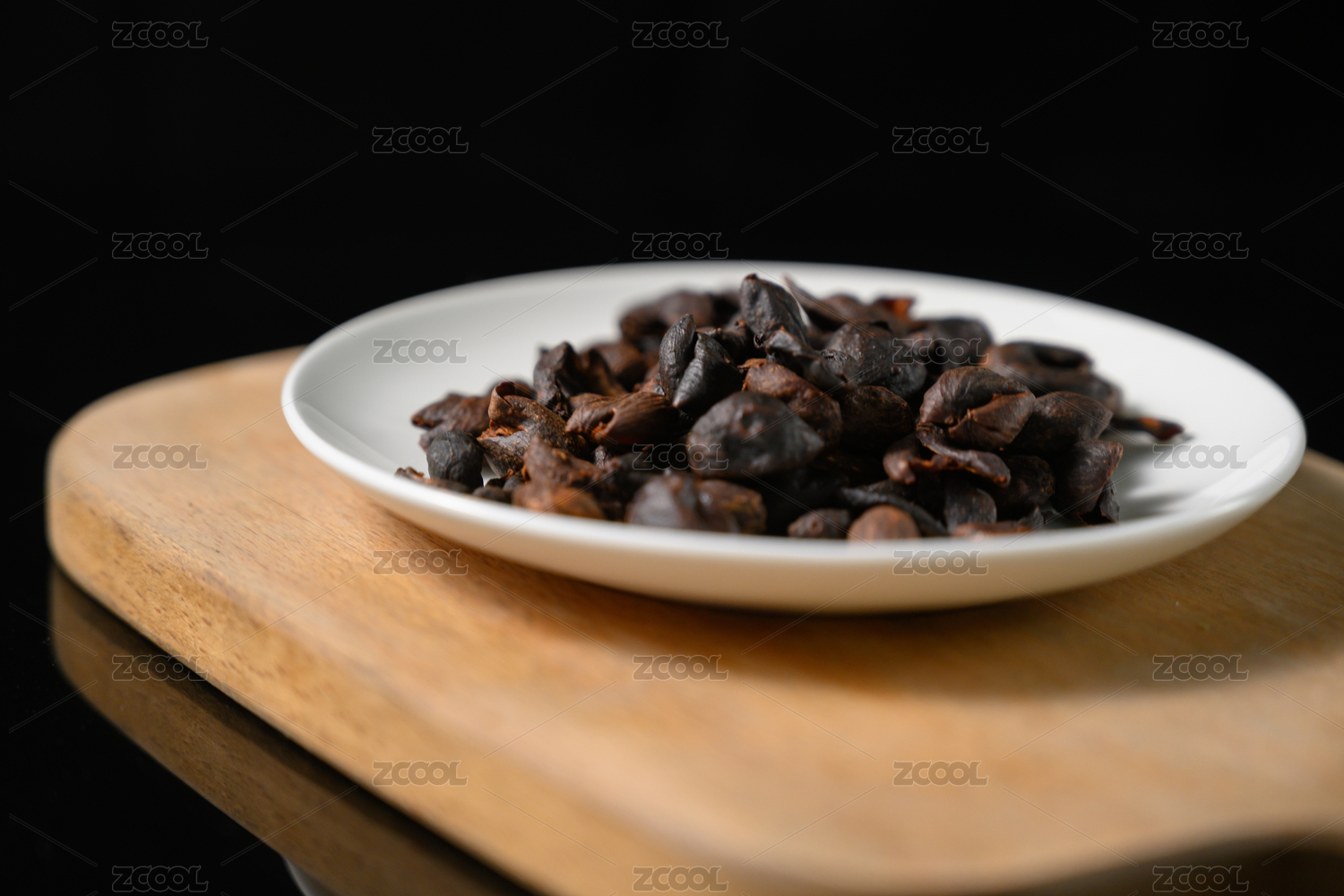 桌面上的盘子里的干爽的咖啡果皮