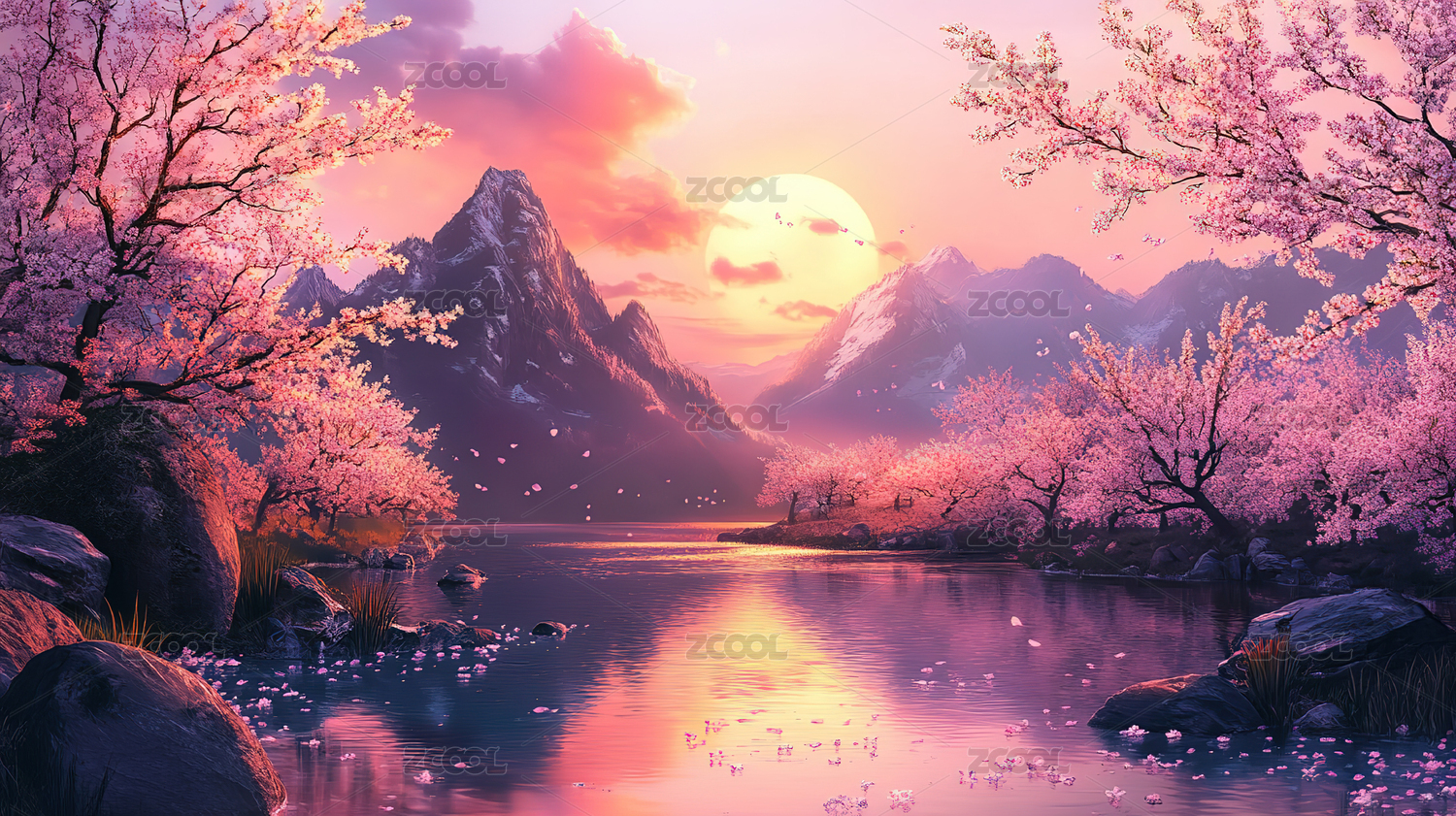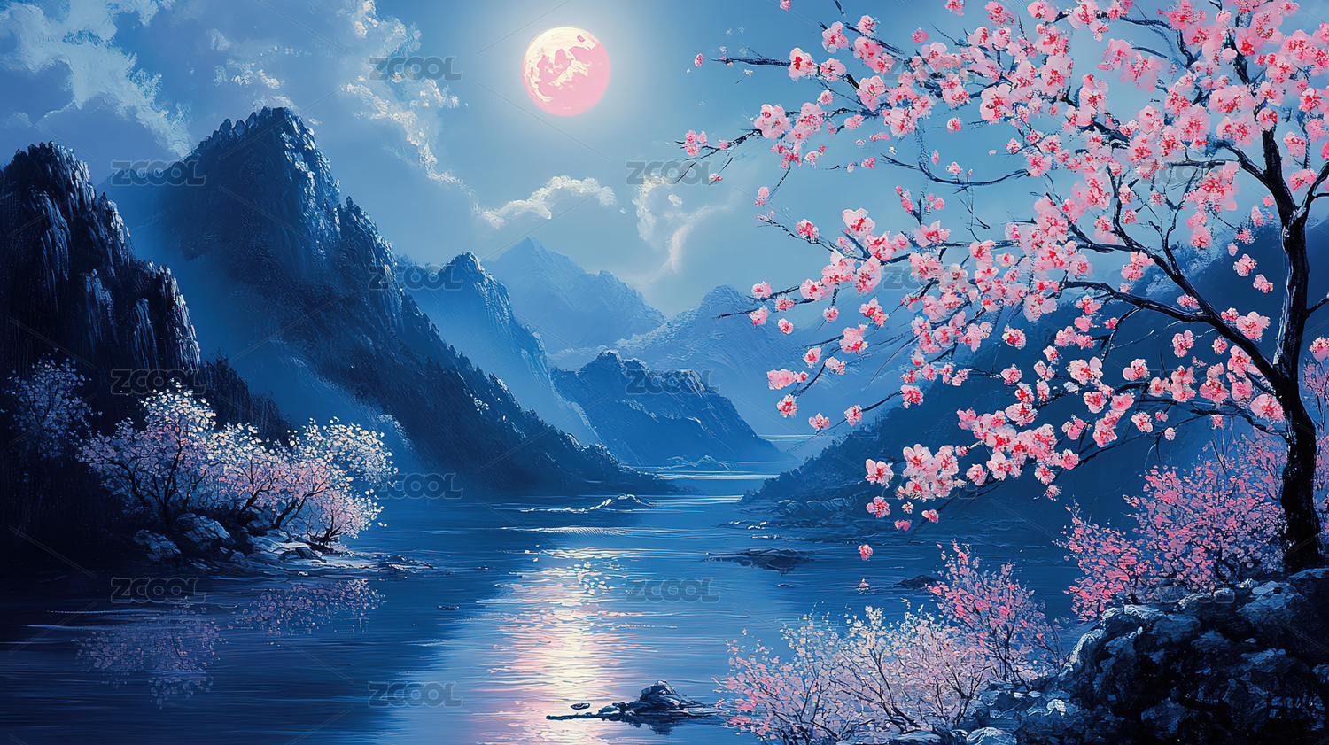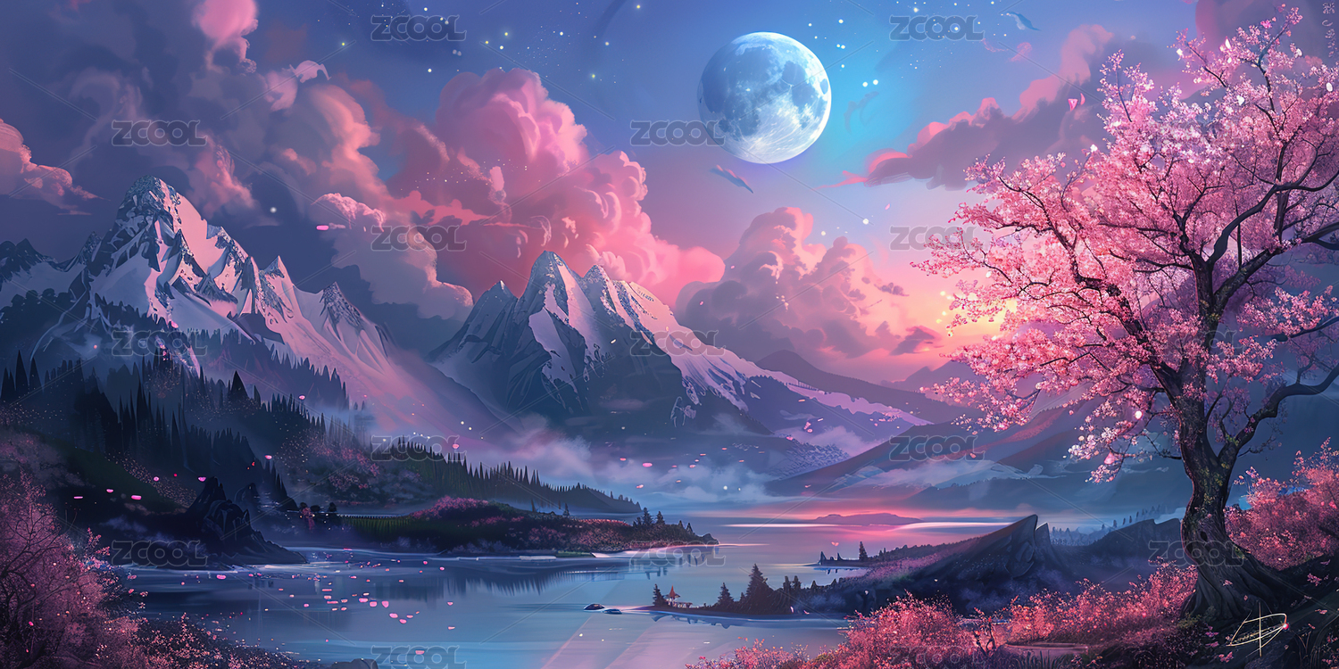 湖面上的樱花和满月