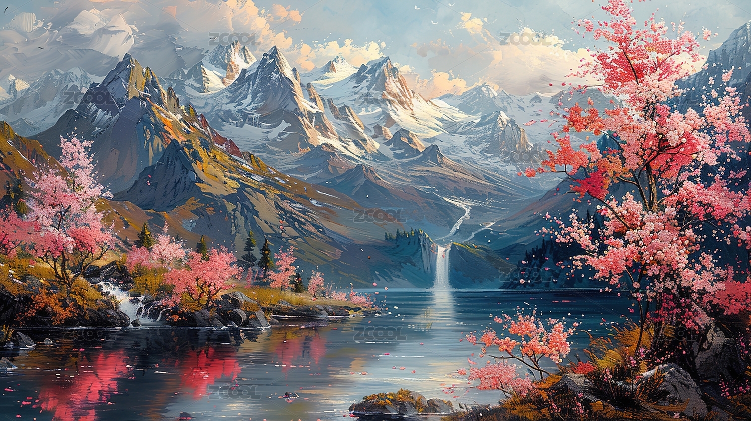 富士山樱花湖泊山水风景画