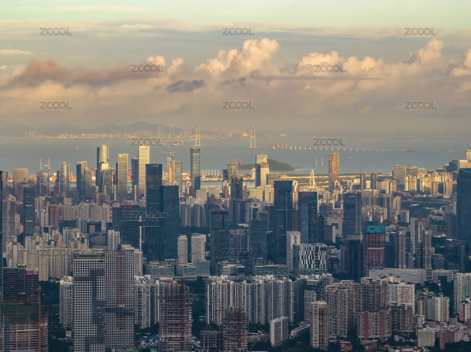夏日黄昏鸟瞰中国广东省深圳城市天际线建筑群高楼大厦风光