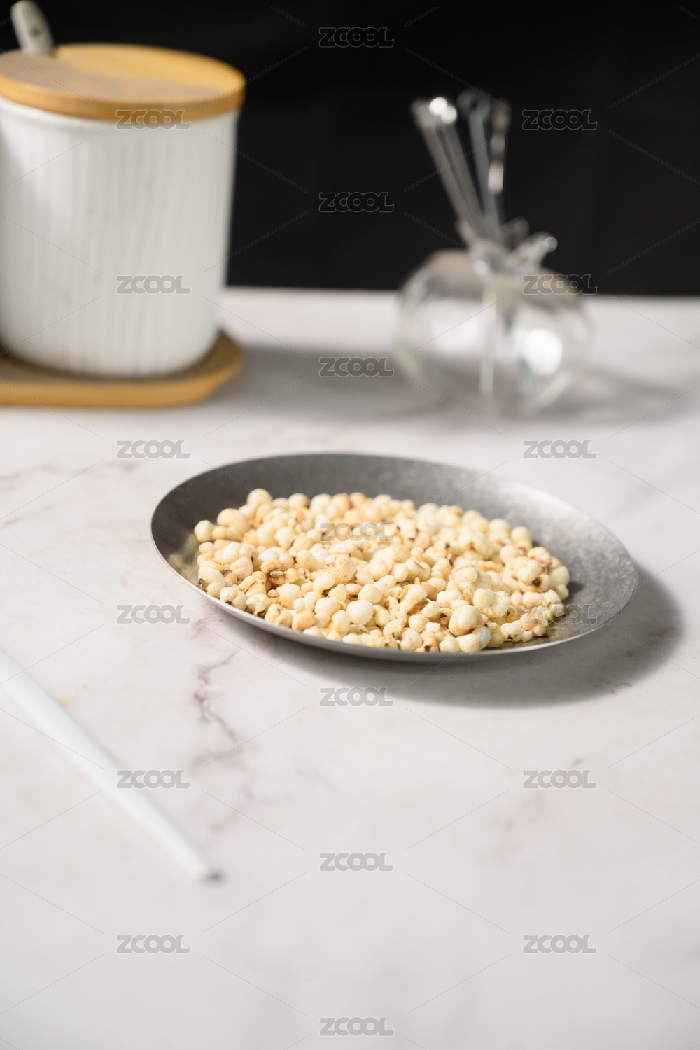 桌面上的玻璃盘子里的新鲜干爽的糙米