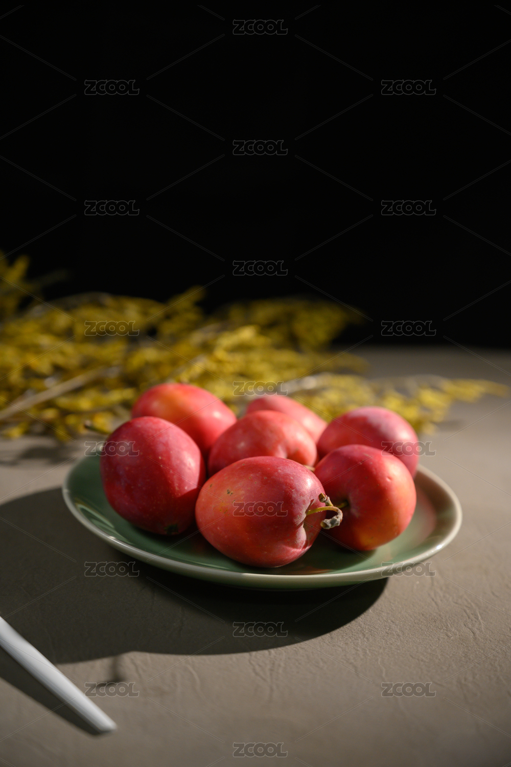 桌面上的盘子里的新鲜海棠果