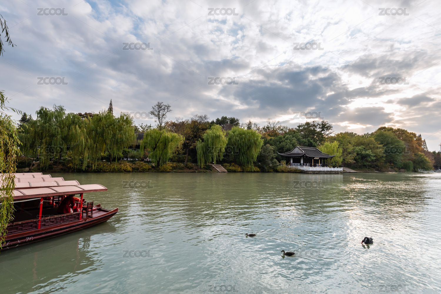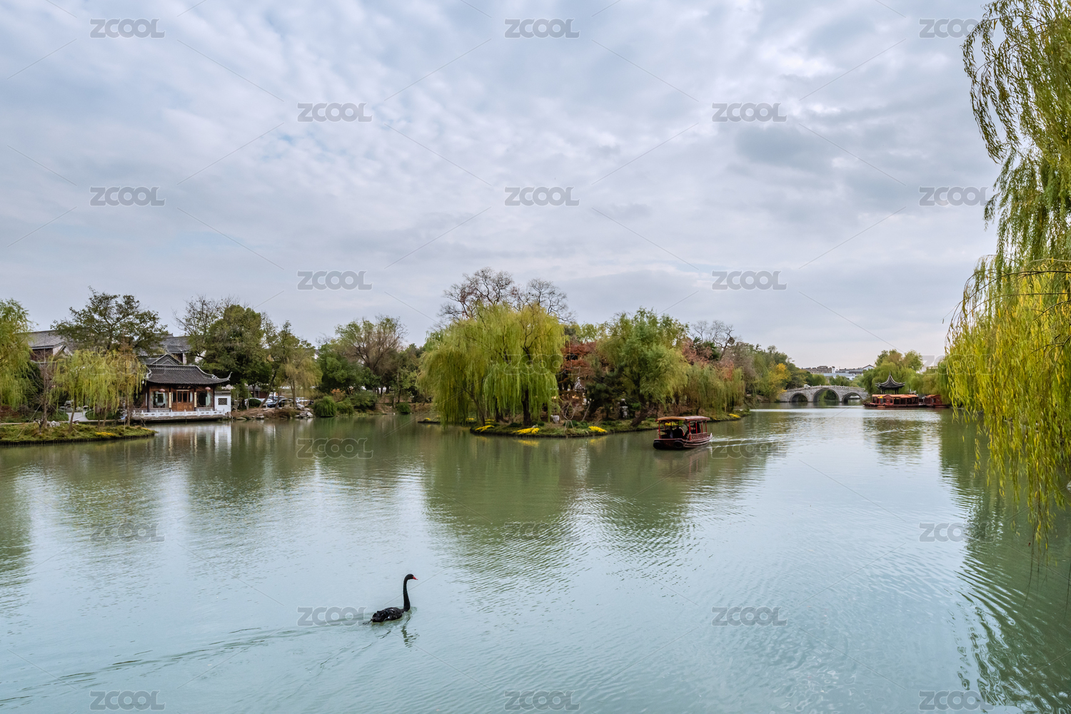 秋天中国扬州瘦西湖的河堤游船天鹅和水榭
