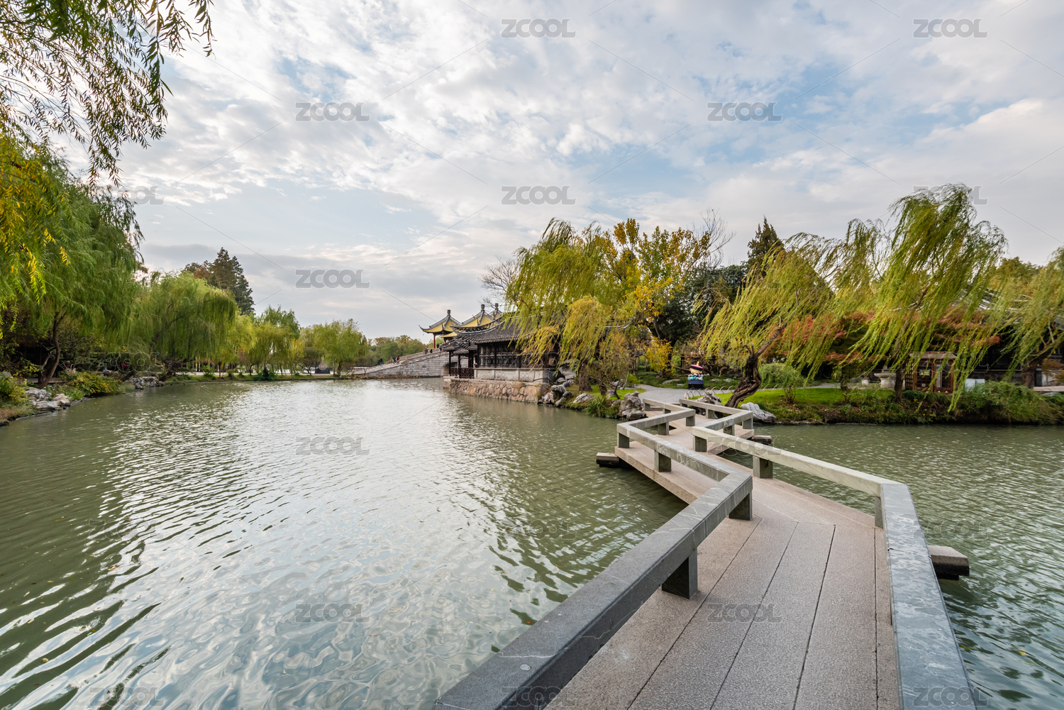 秋天中国扬州瘦西湖风景区的枭庄和游船码头