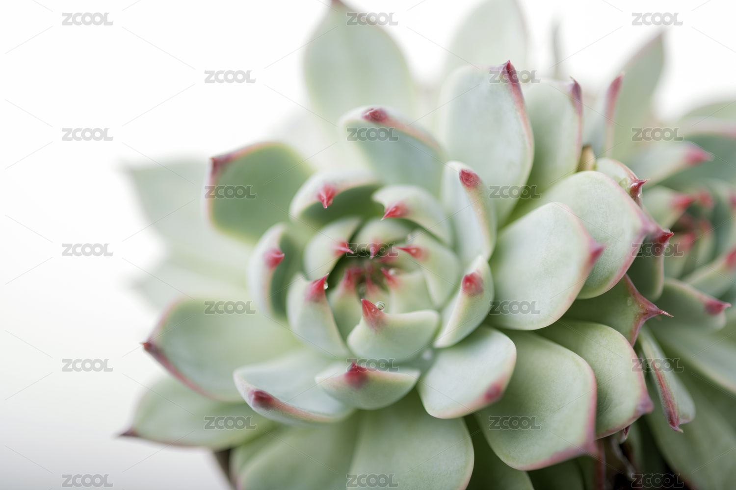 俯视白背景上带水珠的多肉植物石莲属晚霞