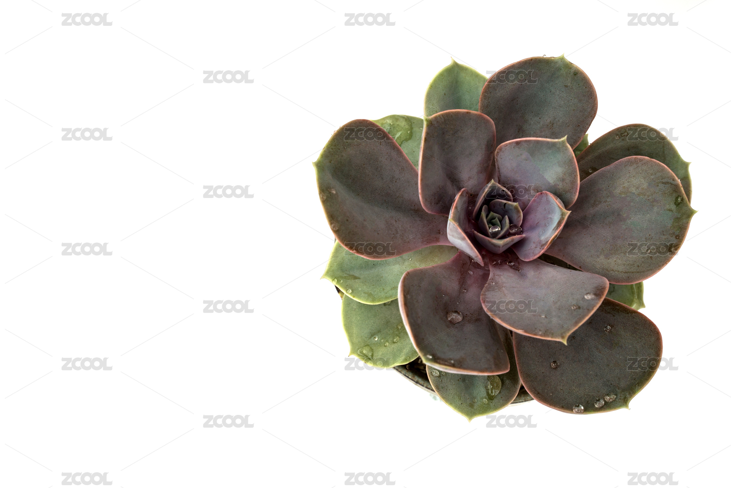 俯视白背景上带水珠的多肉植物石莲属紫珍珠