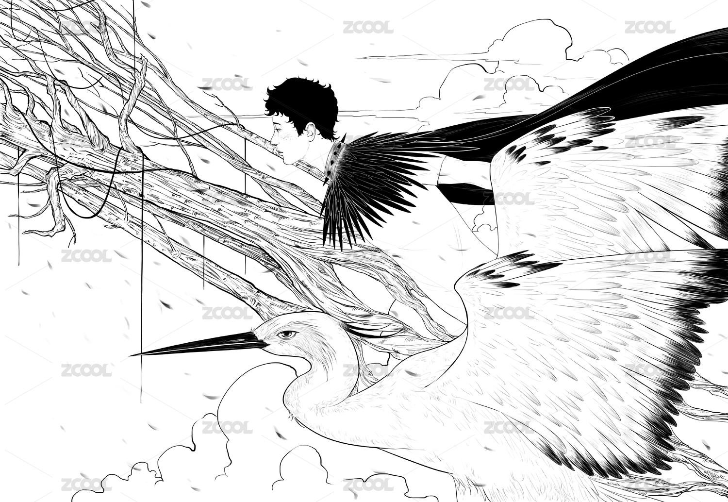 黑白光影女巫帽小女孩站在树林中喂鸽子