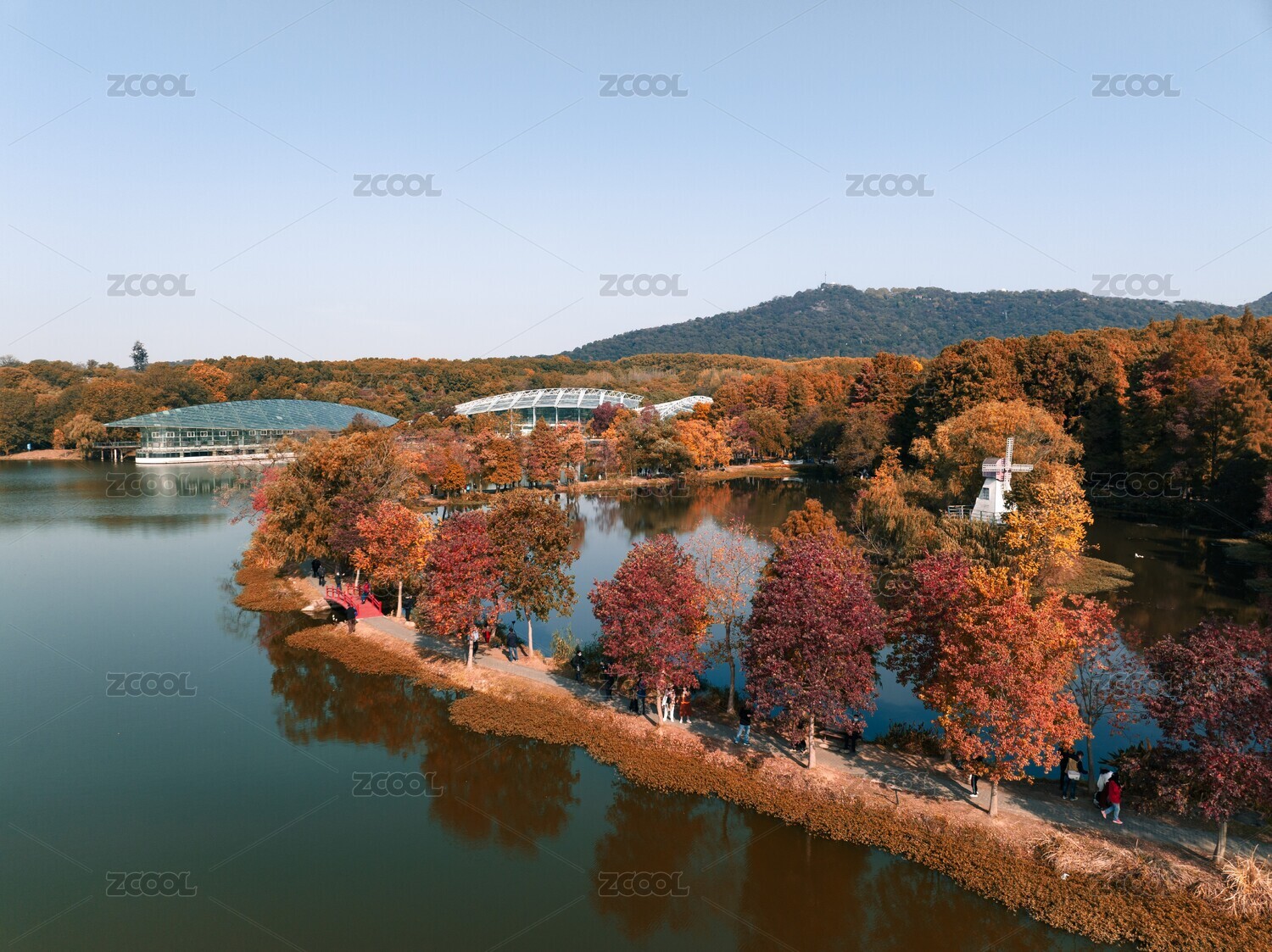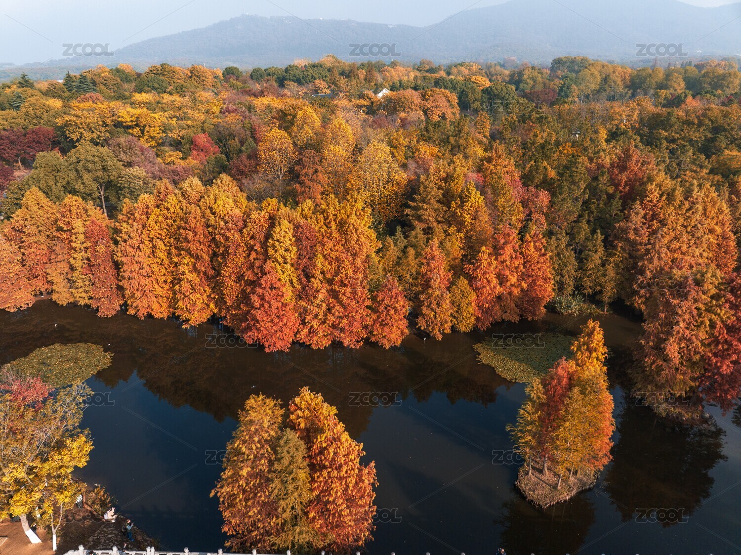 航拍南京紫金山下燕雀湖岸边的红色水杉