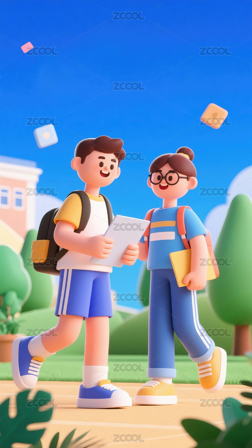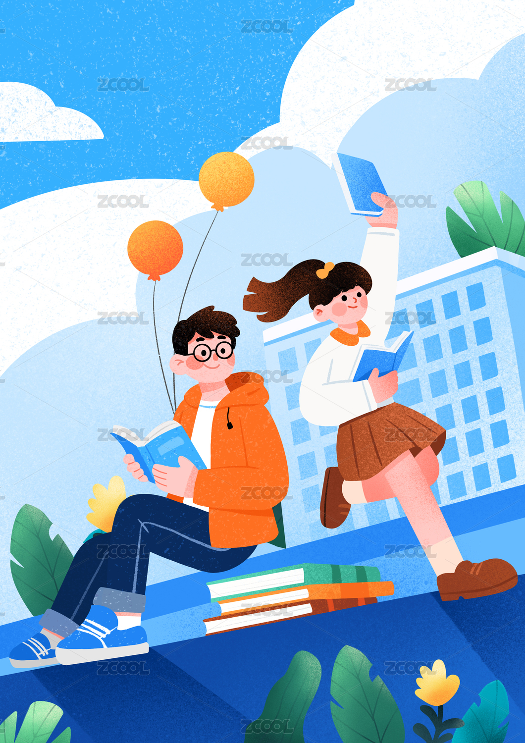 插画,教育,开学,新学期,学校,学生,男生,女生,蓝天,白云