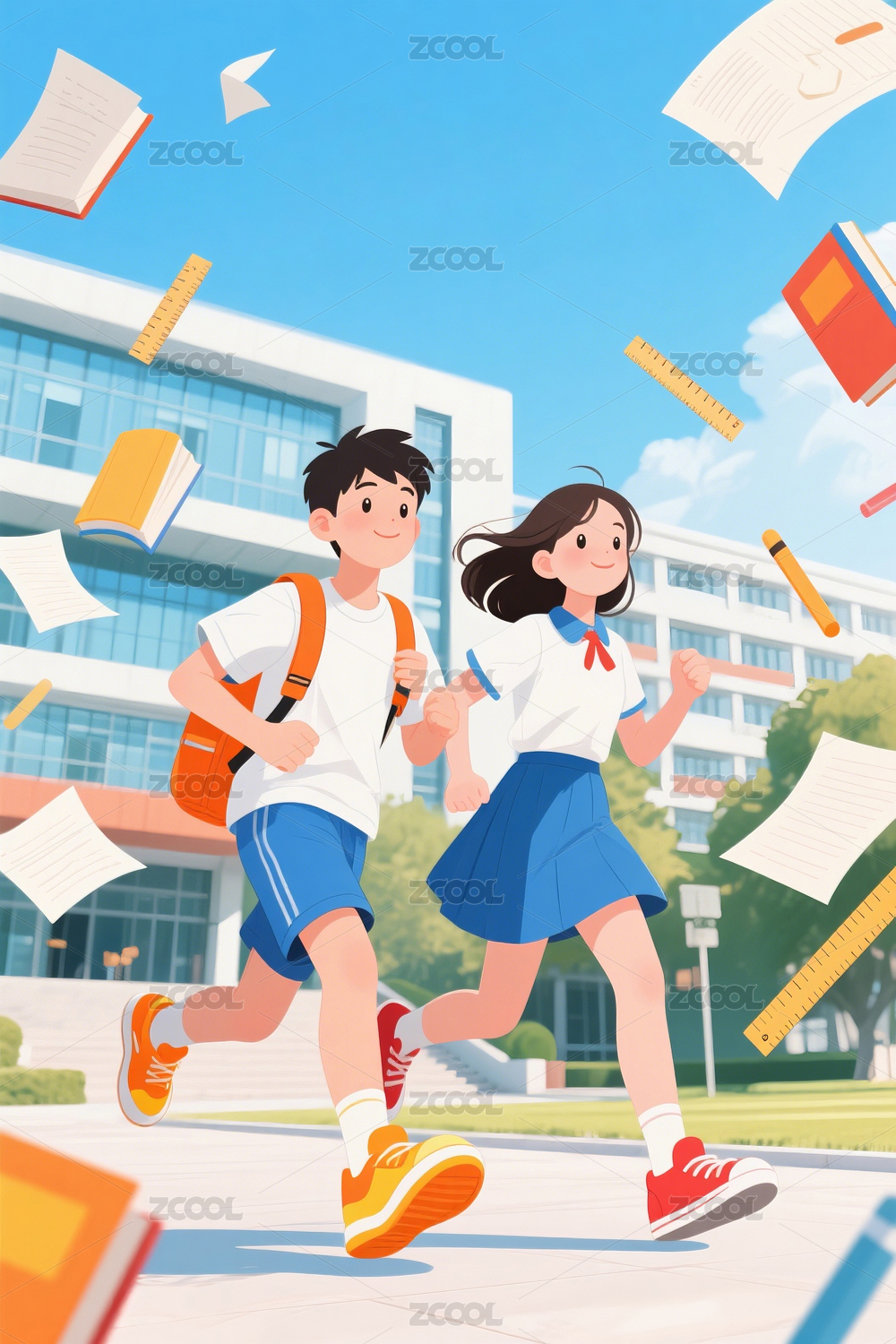 矢量插画校园中奔跑的青春少年少女