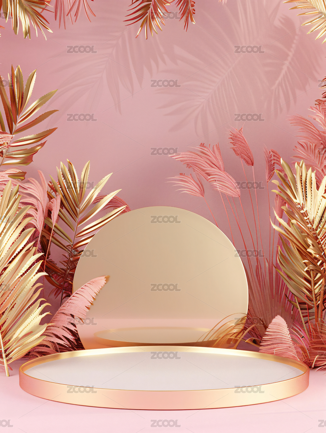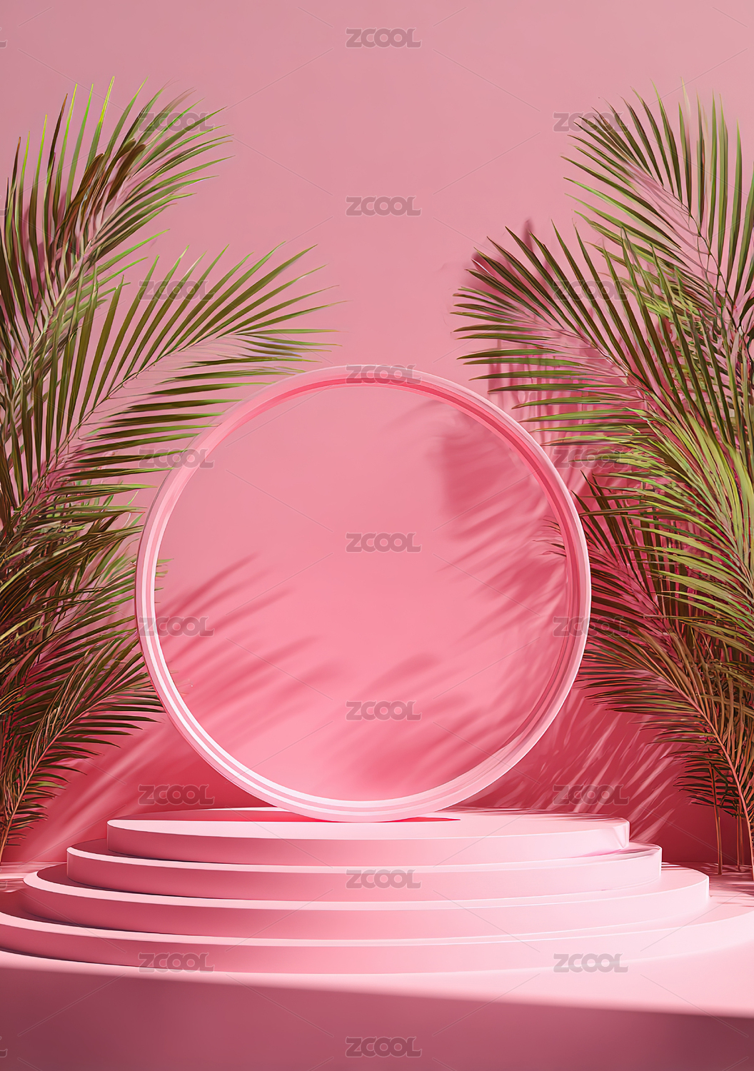 粉色圆形舞台与棕榈叶装饰