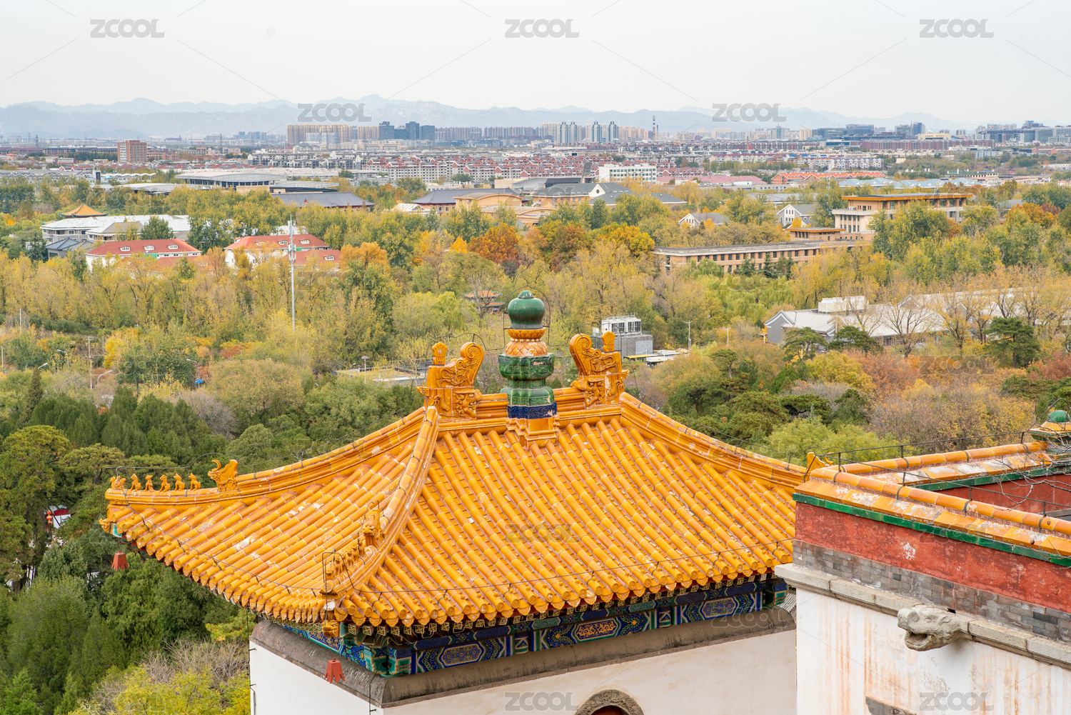 秋天蓝天下的北京颐和园公园的古亭台楼阁建筑