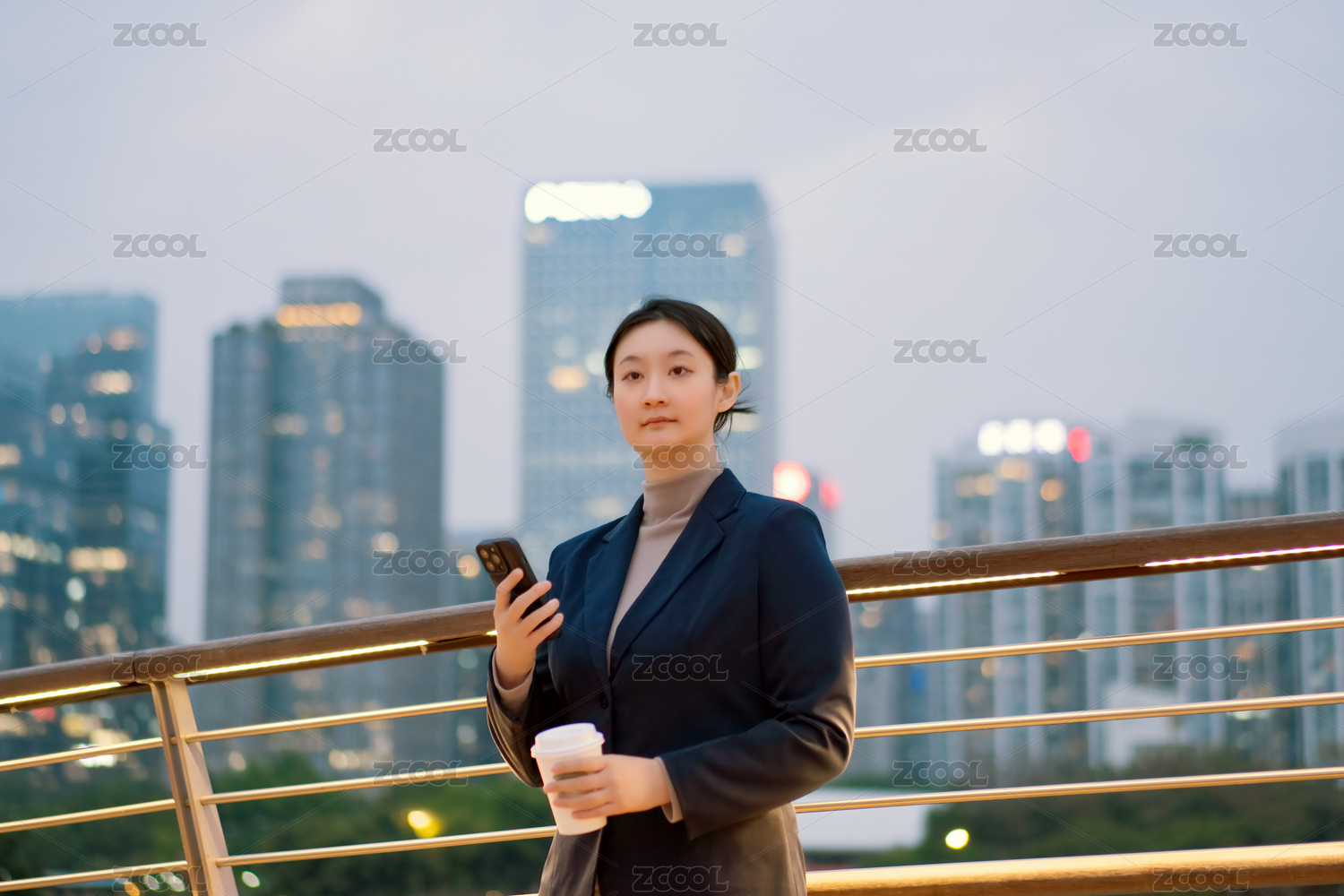 职业女性在户外拿着智能手机和咖啡