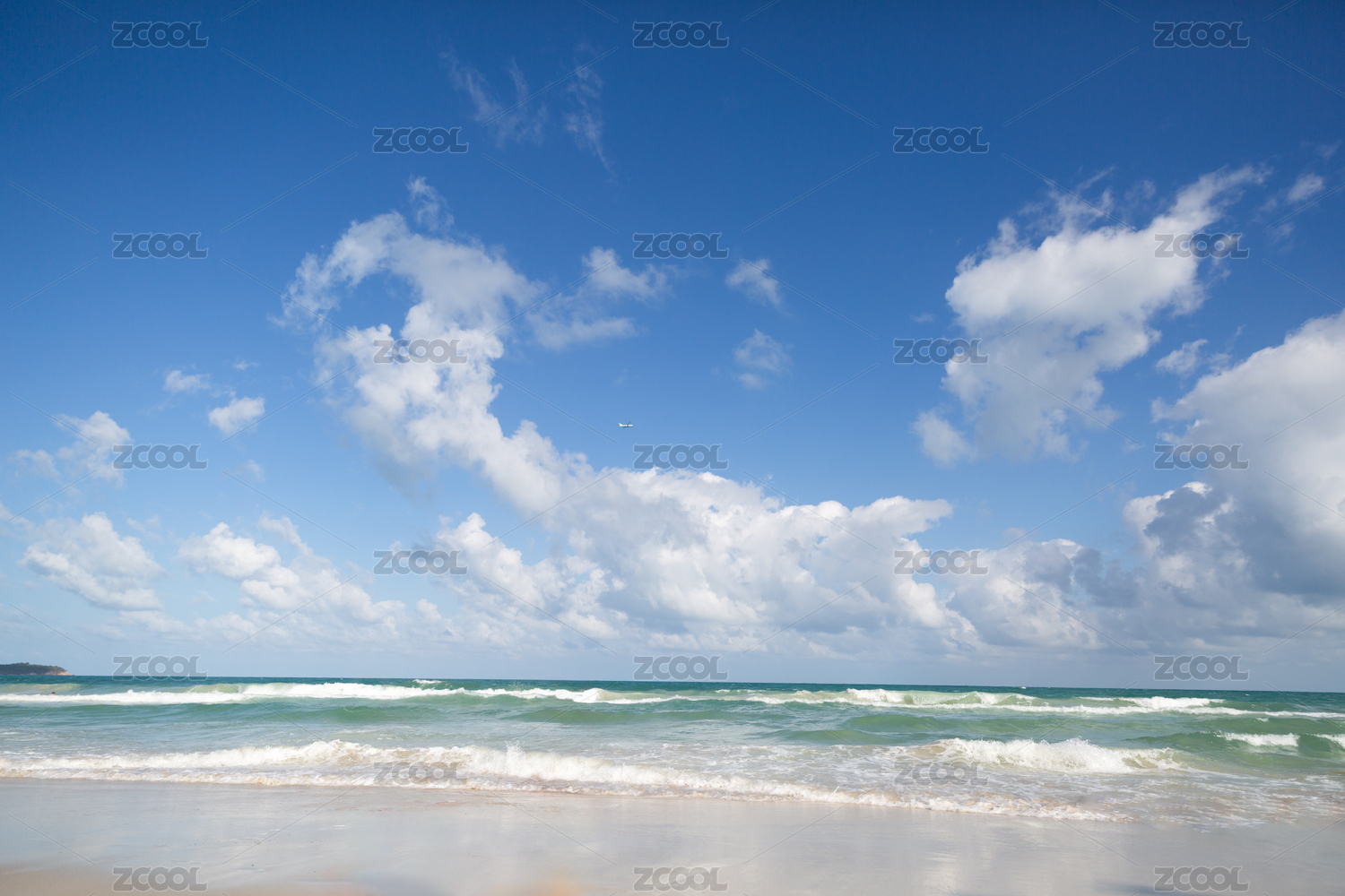 蓝天白云下清澈湛蓝的大海和金黄色的沙滩
