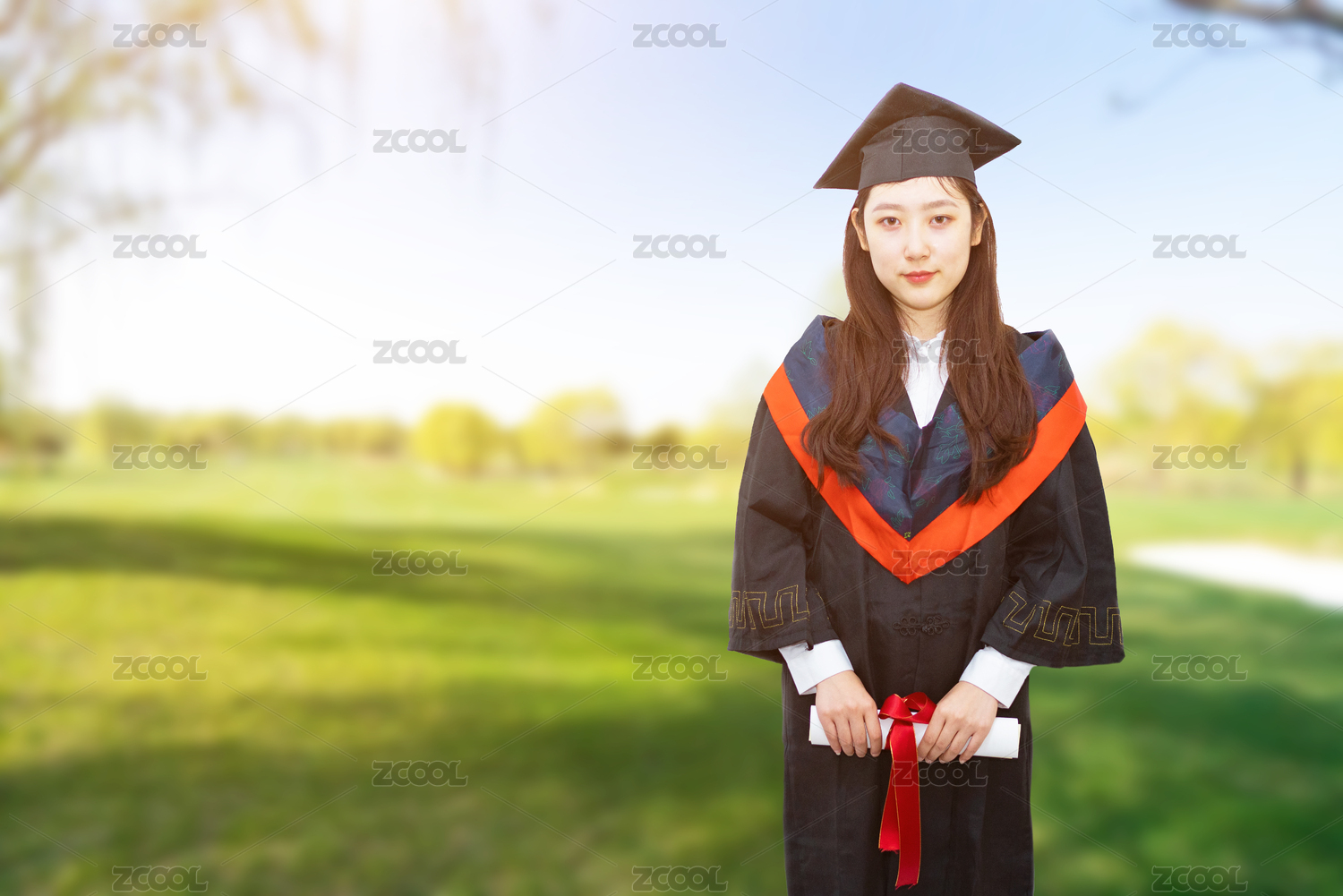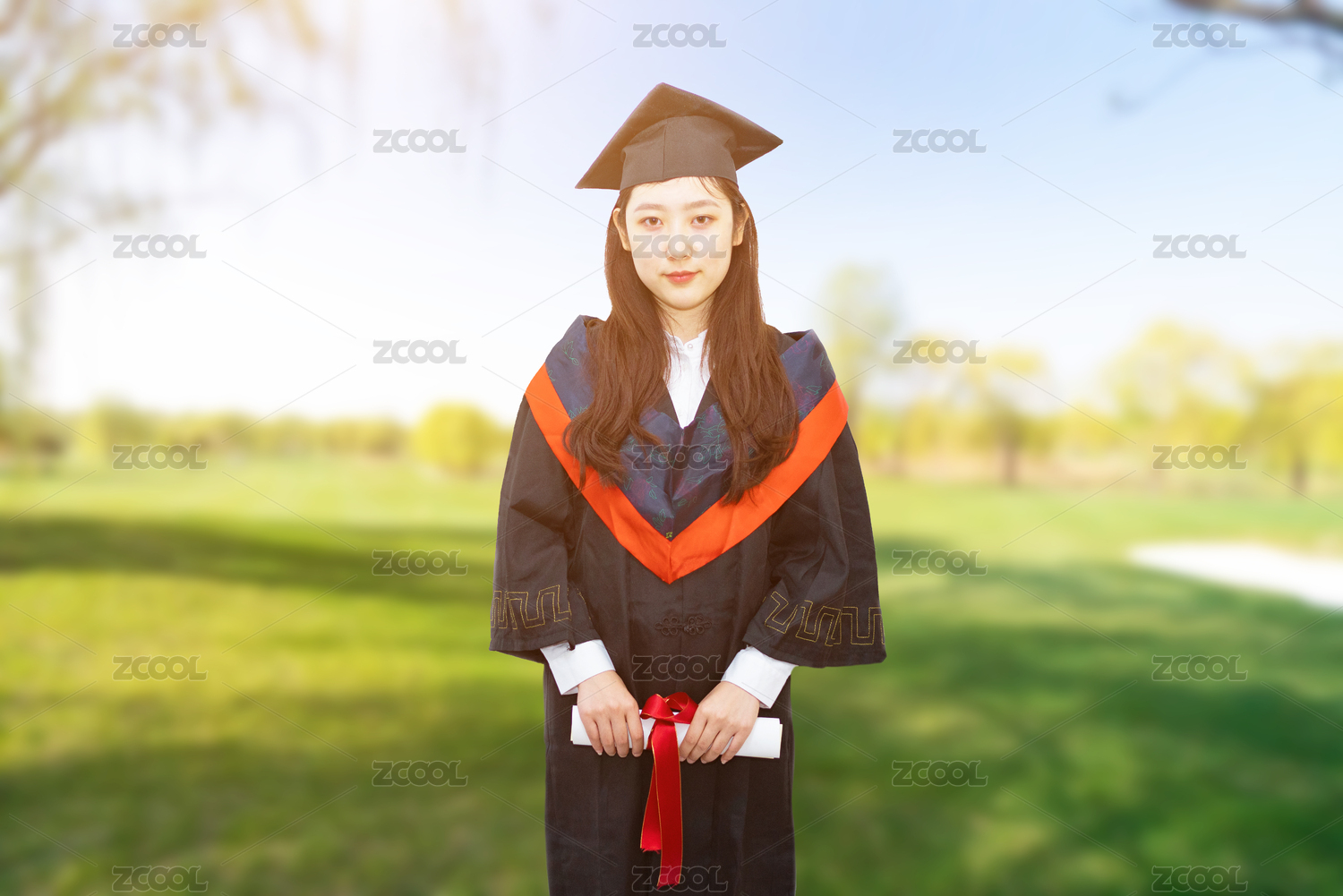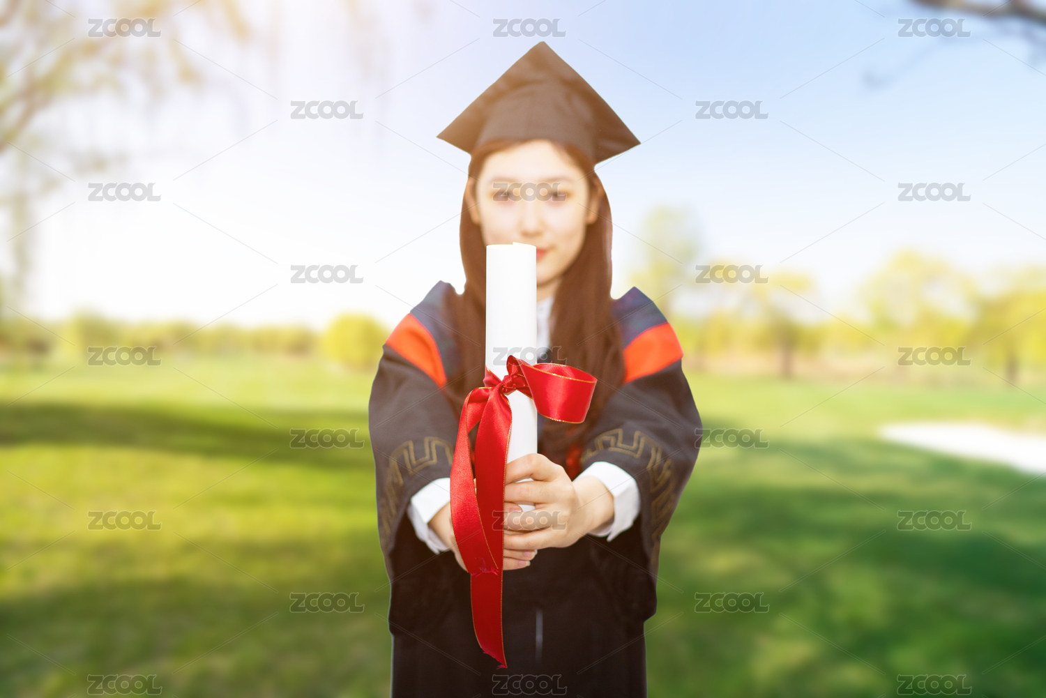 中国人美女大学生手拿毕业证书穿着毕业礼服校园草坪上开心的微笑