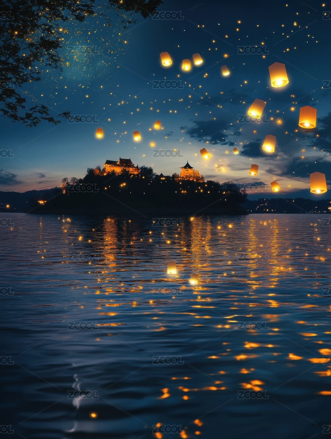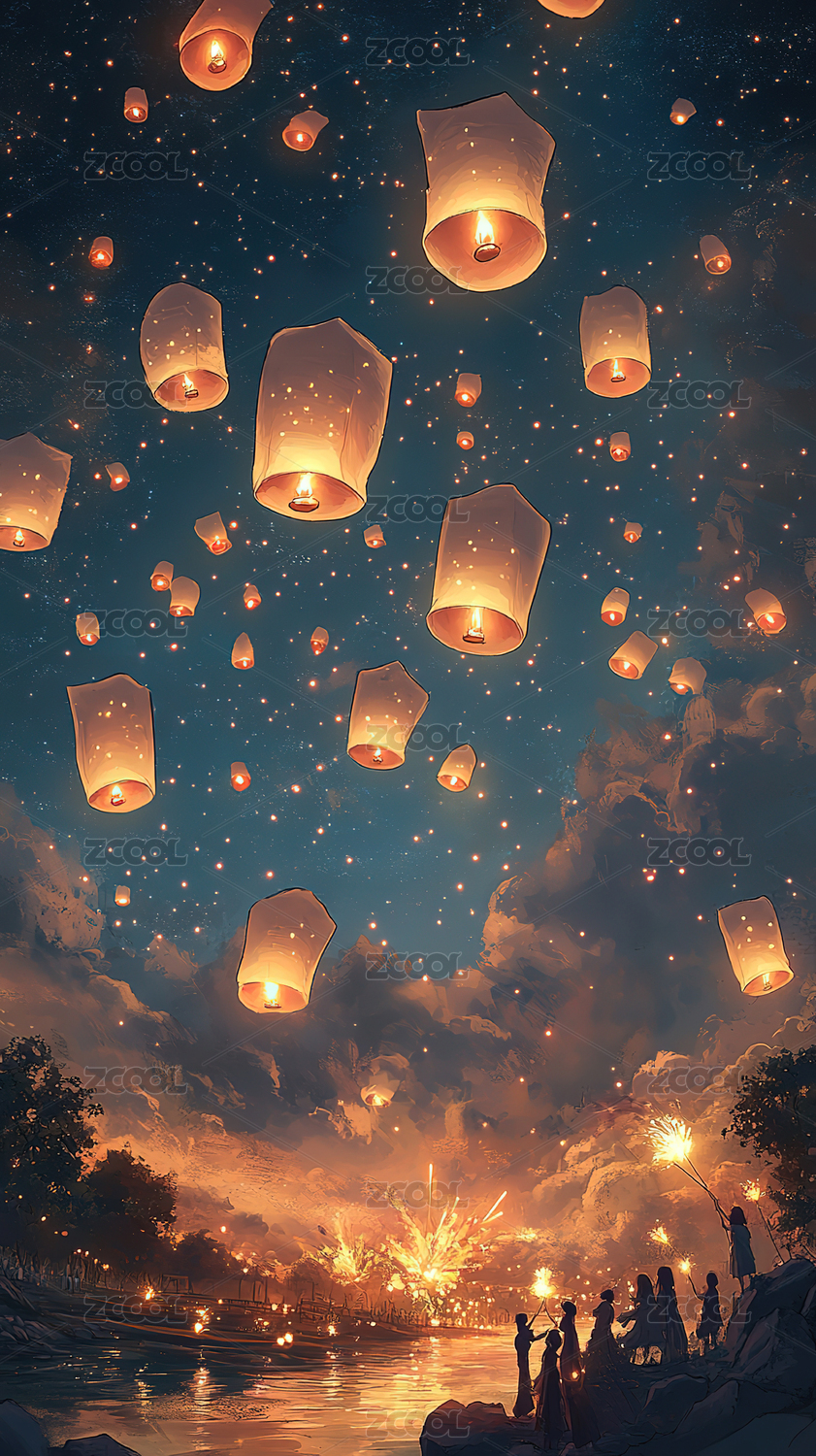 孔明灯,河边,夜空,星星,水面,光影,梦幻,唯美,文化,传统