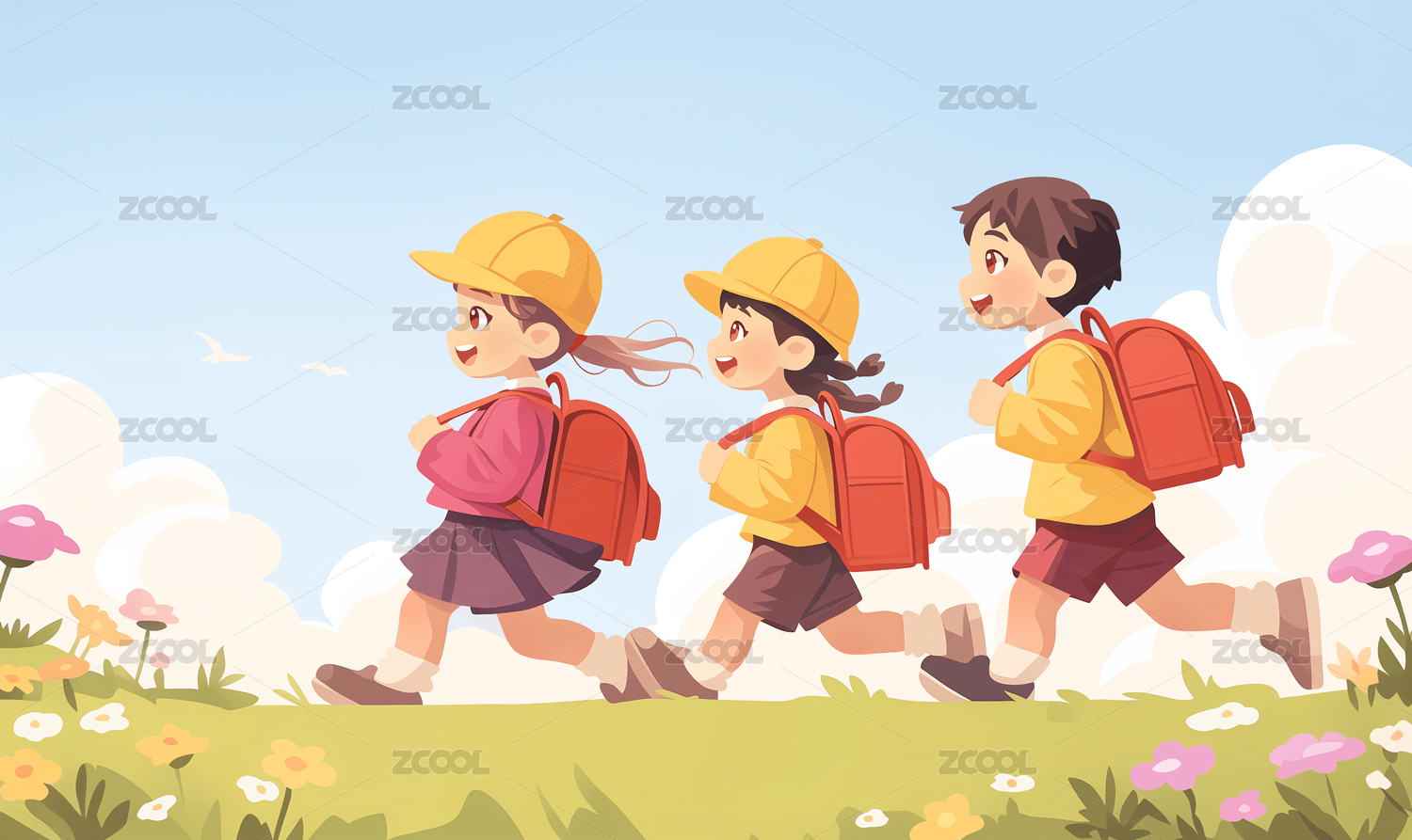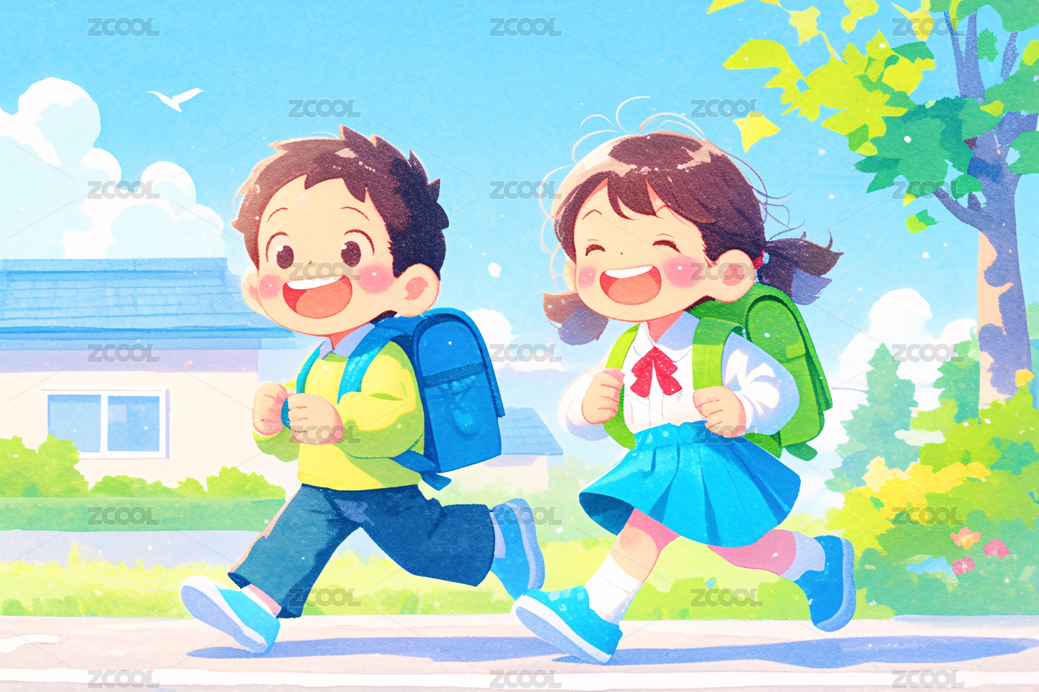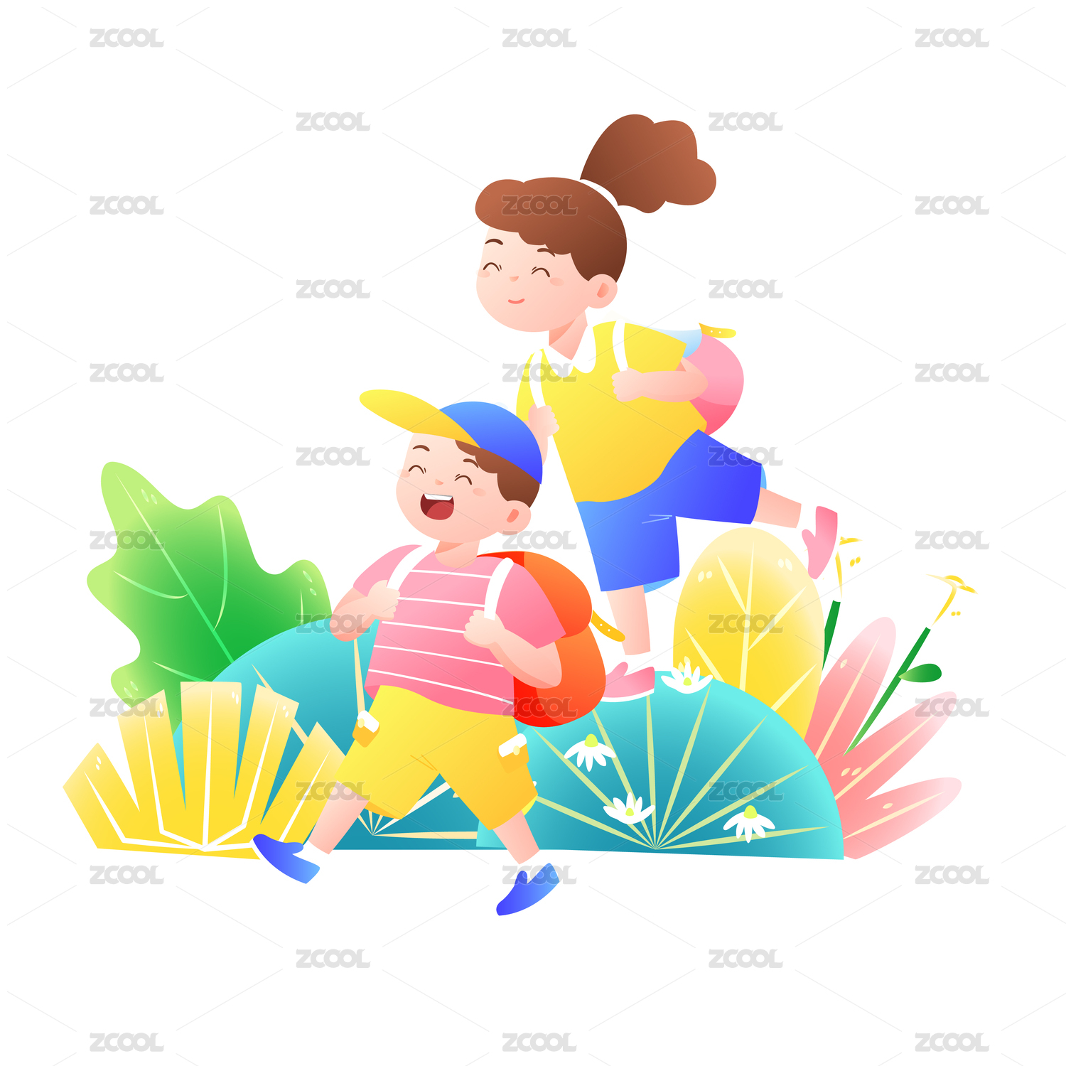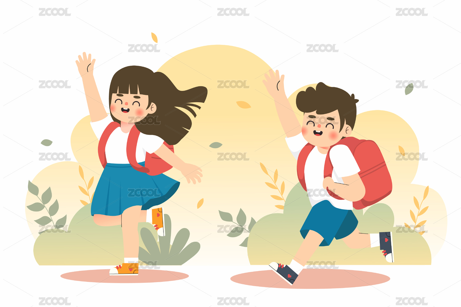 小男孩和小女孩背着书包在跑道上跑步 手绘插画
