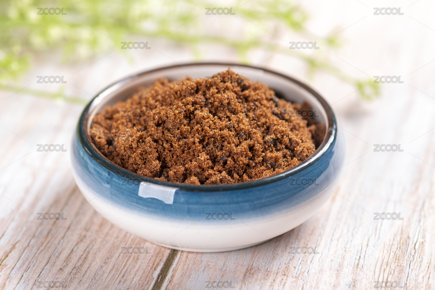 木底上放着一碟红糖粉和勺子上挖着土红糖