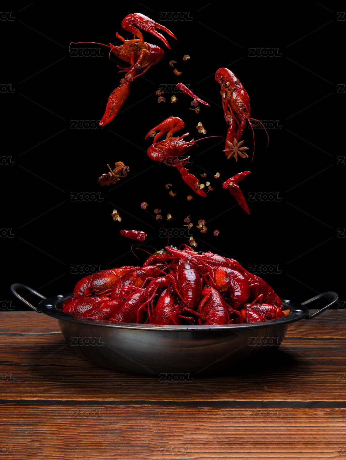 木纹桌面上装满一锅的红烧小龙虾