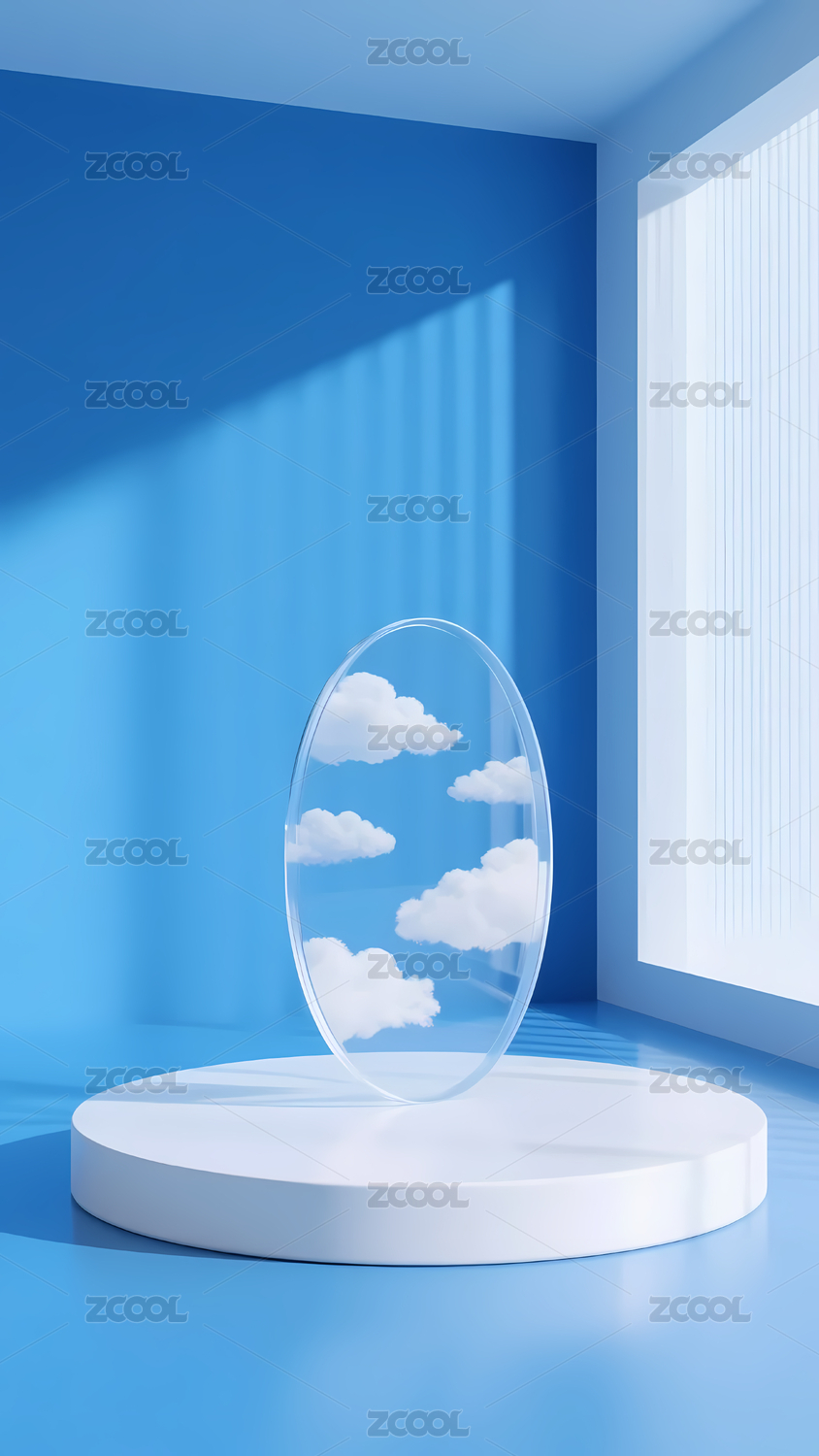 室内,场景,圆形,白色,台面,质感,装饰,装置,绿色植物,绿叶半透明白色窗帘