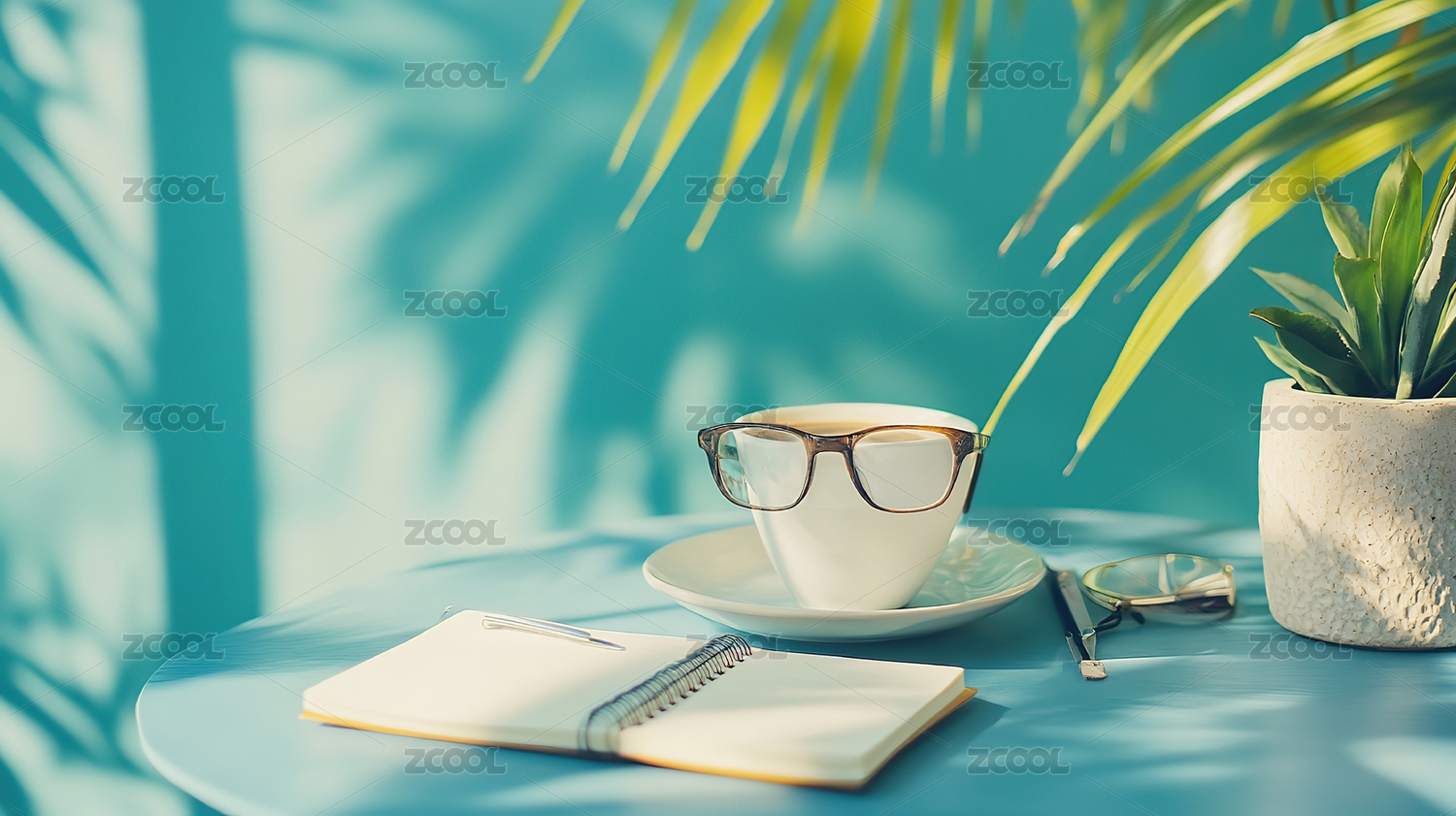 商务,办公,办公桌,桌面,物品,咖啡,眼镜,圆形,植物,简约