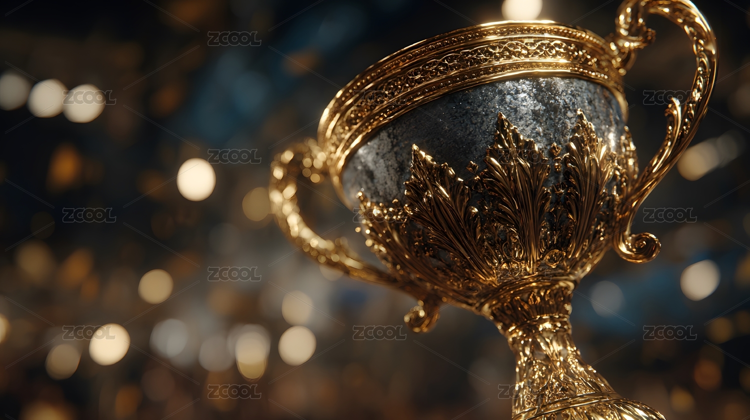 闪亮的金色奖杯与背景夜光散景,比赛冠军成