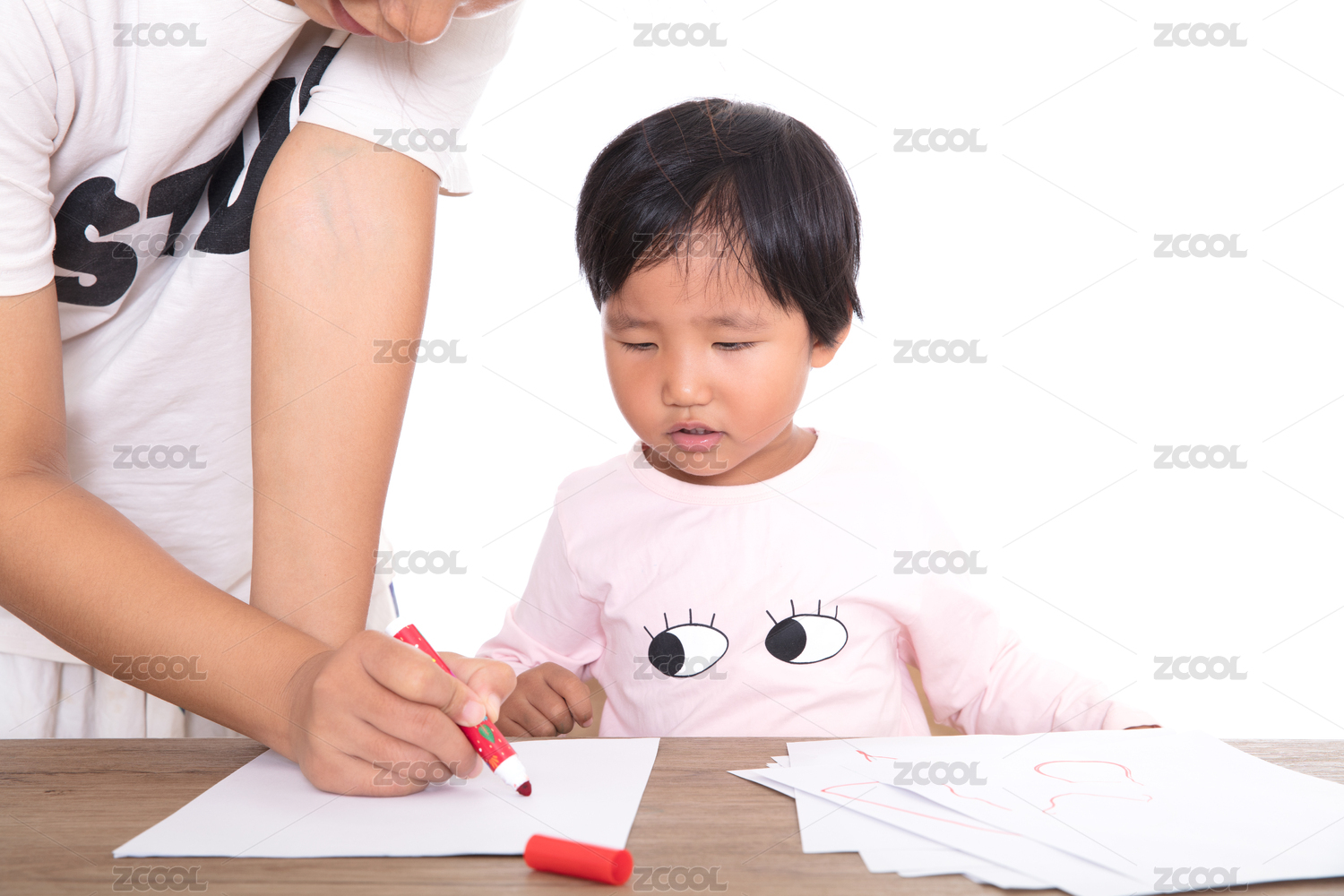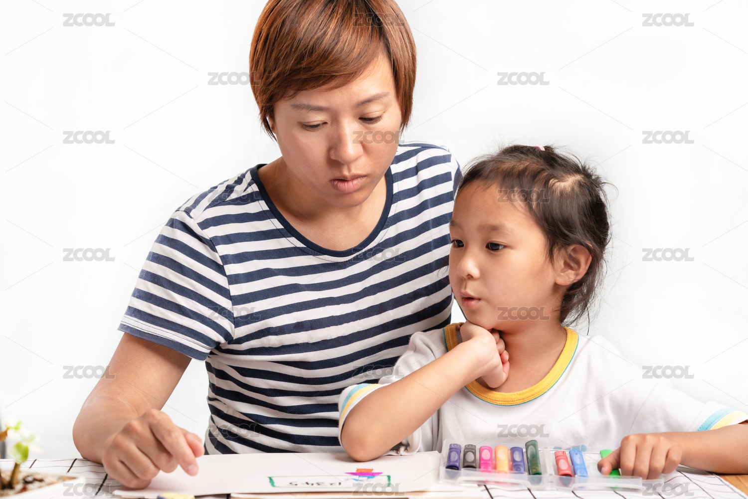 白背景前老师或孩子的妈妈在教孩子学习绘画