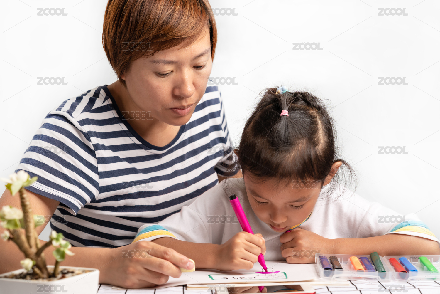 年轻的妈妈或幼教老师在认真的辅导小女孩画画