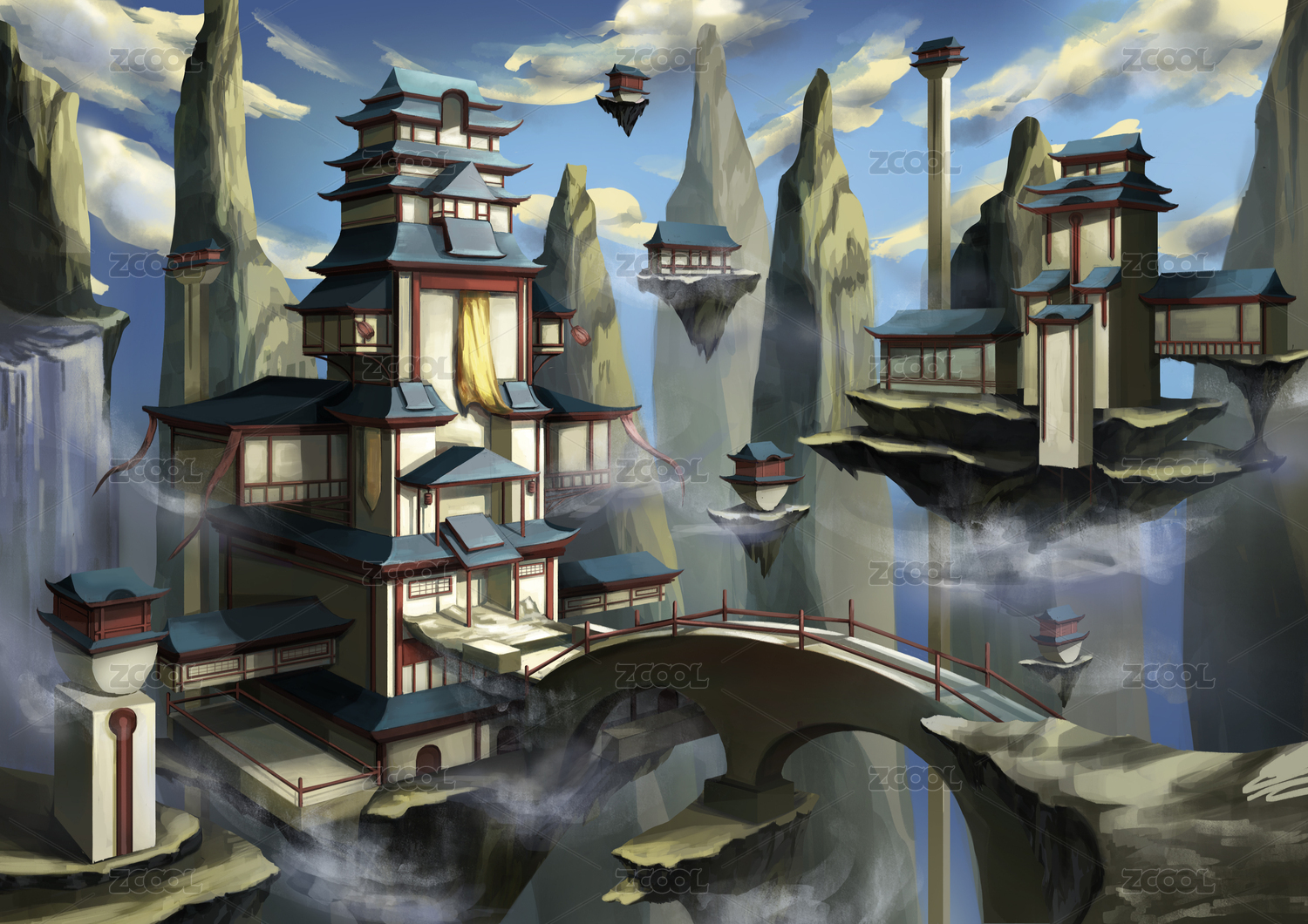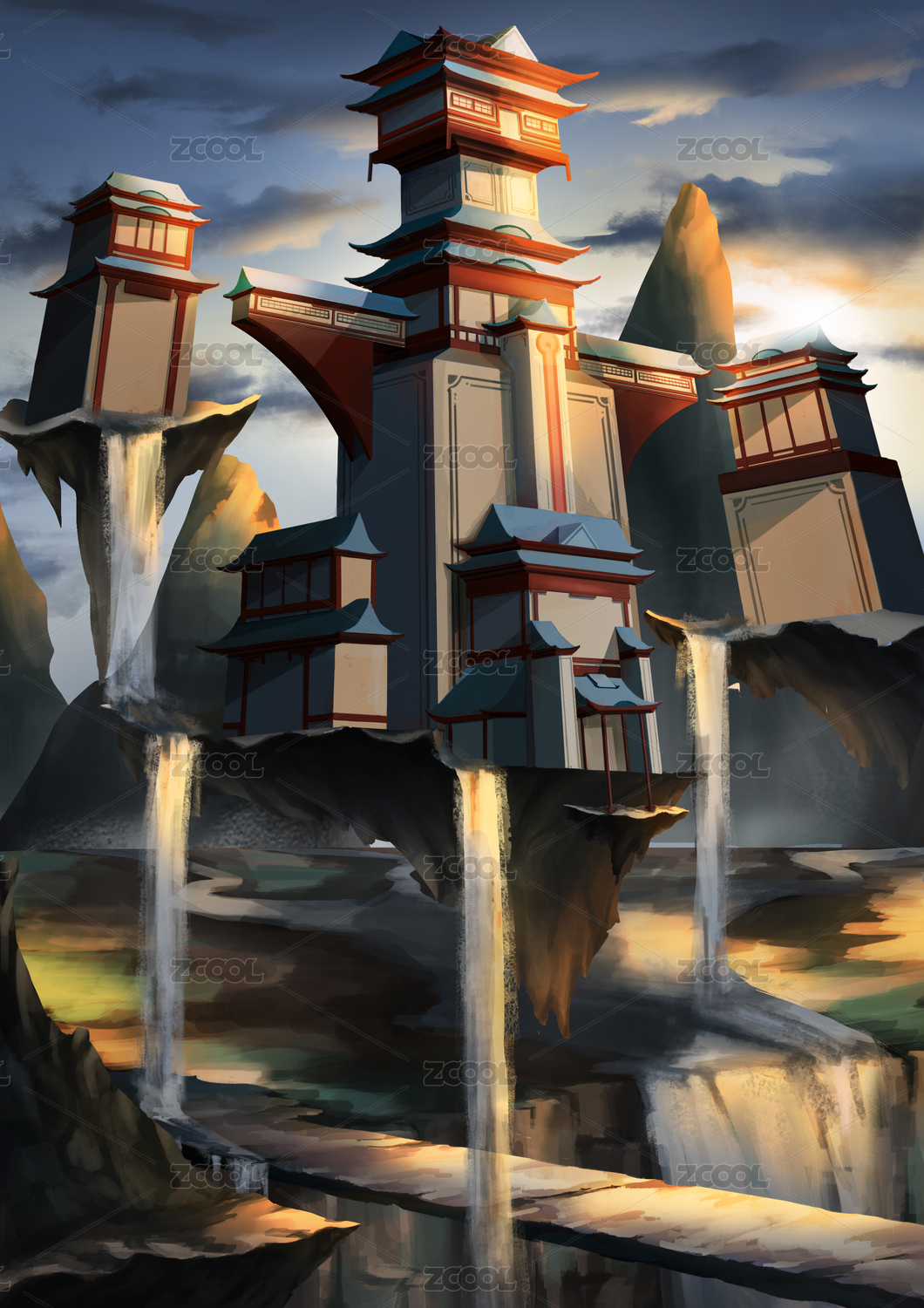 古风仙侠门派仰视写实场景游戏概念原画插画